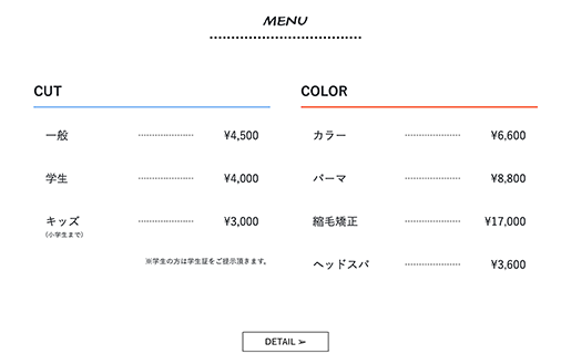 問い合わせが多い料金については大きく余白をとってわかりやすく配置。また、男性への敷居も下げるようカラーをユニセックスな配色にしました。