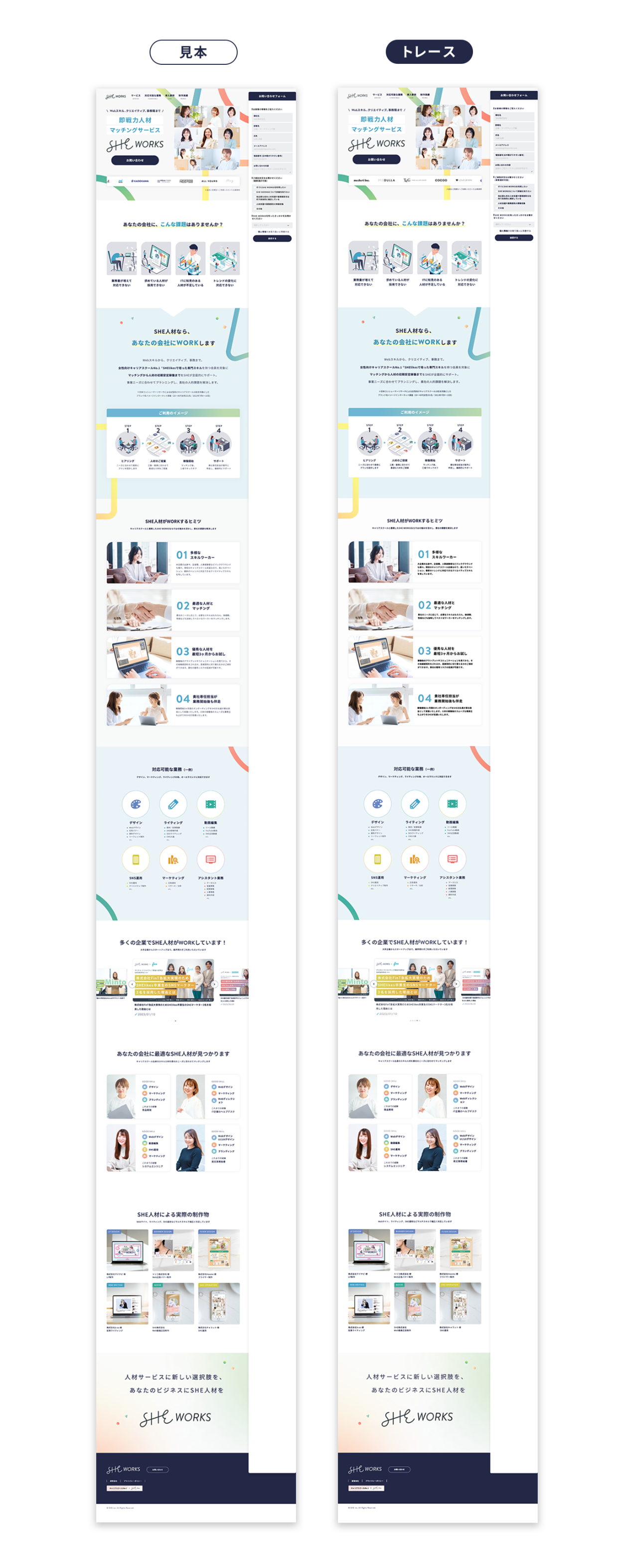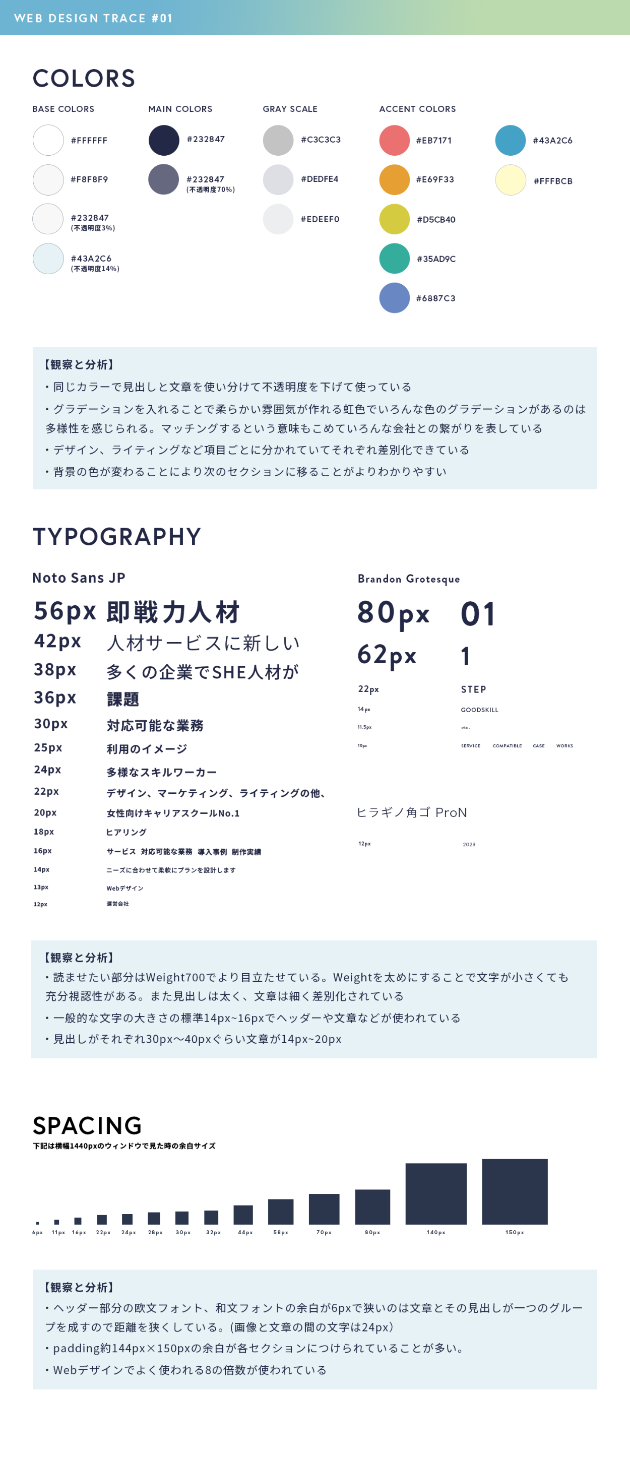 ⚫︎SHElikes MULTI CREATOR COURSEでの課題制作 LPトレース/スタイルガイド/PC,SPサイズの違いや分析/資料としてまとめる 制作期間:2週間
