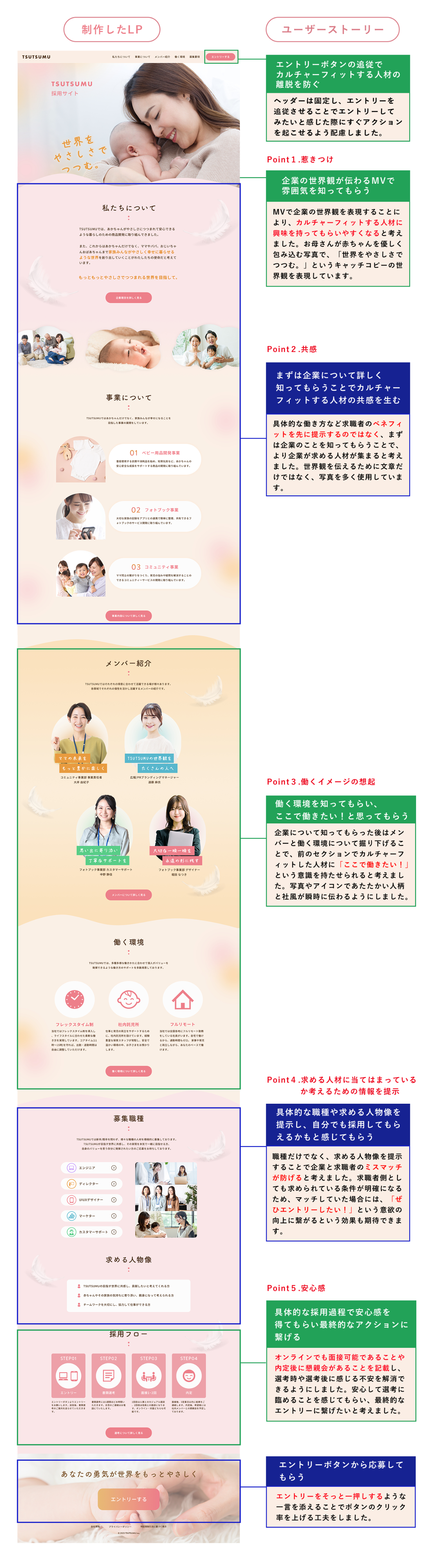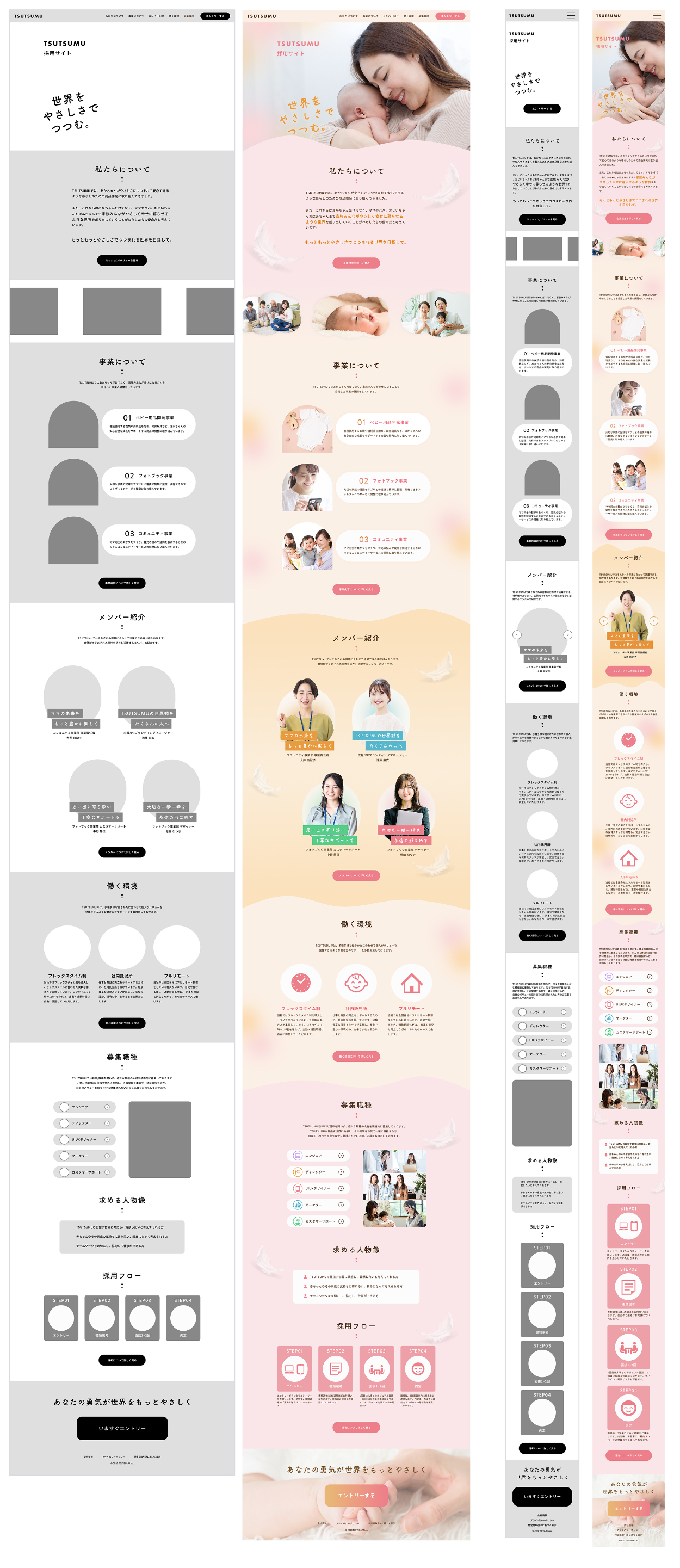 TSUTSUMUのキャッチコピーが「世界をやさしさでつつむ。」であったため、あたたかくやわらかい雰囲気にしたいと考えました。企業側としてもカルチャーフィットする人材にエントリーしてもらいたいということで、世界観に共感してくれる人材がアクションを起こしてくれるようビジュアルでの世界観の表現に力を入れました。色ではメインカラーにピンク・ベージュ、ベースカラーにオレンジを使用し、暖色系のカラーであたたかさとやわらかさを表現しました。あしらいにも羽や水彩のような円形を配置したのと、写真を雲形に切り抜いてイメージを表現したのがポイントです。