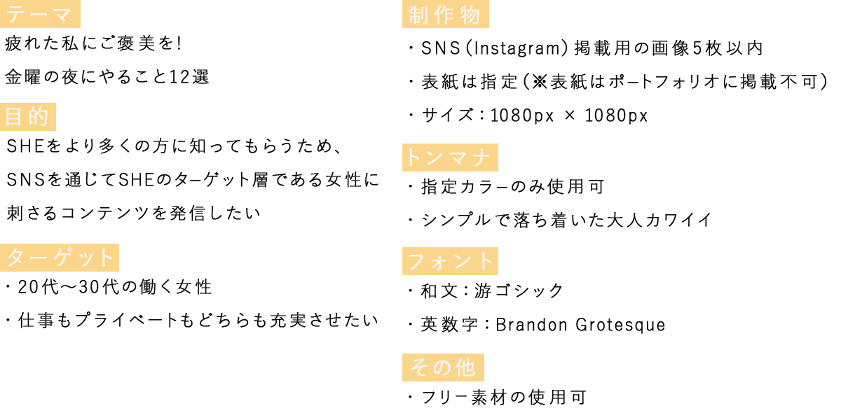 女性向けキャリアスクール SHElikes様のInstagramに投稿するコンテンツのクリエイティブを制作しました。要件、情報設計、デザインポイントにまとめています。[制作期間:7日 使用ツール:Photshop]
