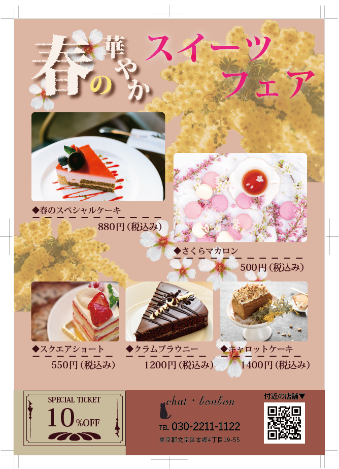 ポスター YAMAUCHI フリー OVERVIEW 架空のケーキ屋の春のイベントポスター 店名がフランスに由来するものなので、フランスの春を象徴するミモザとアーモンドの花を背景に置いています。ベースカラーも春らしくもあり、それでいて日本の春のイメージであるピンク色になりすぎないようアポロチョコのような色にしました。