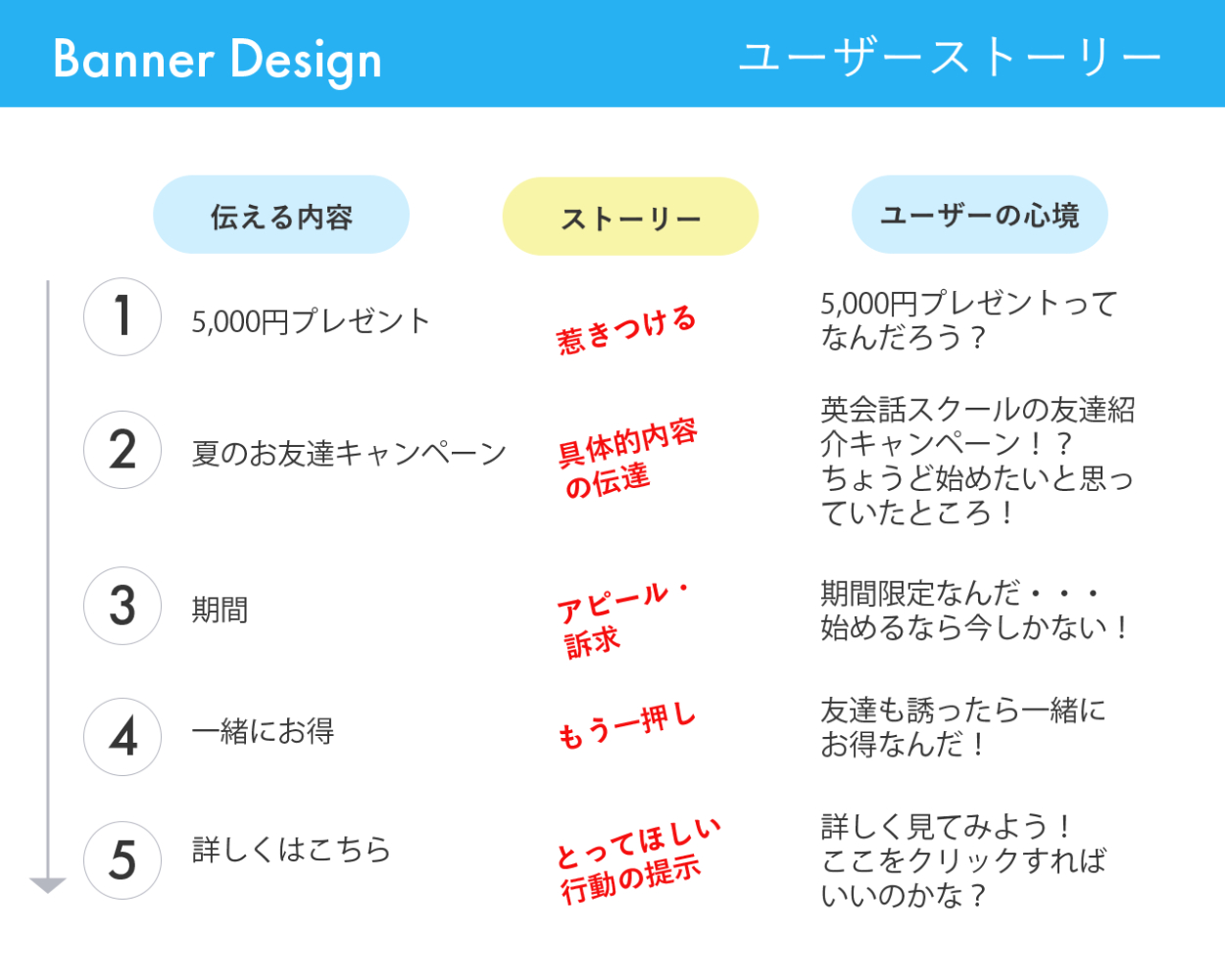 「5,000円プレゼント」のワードでユーザーの興味を引き、左上から右下になぞって視線誘導をしていくストーリーを作成しました。