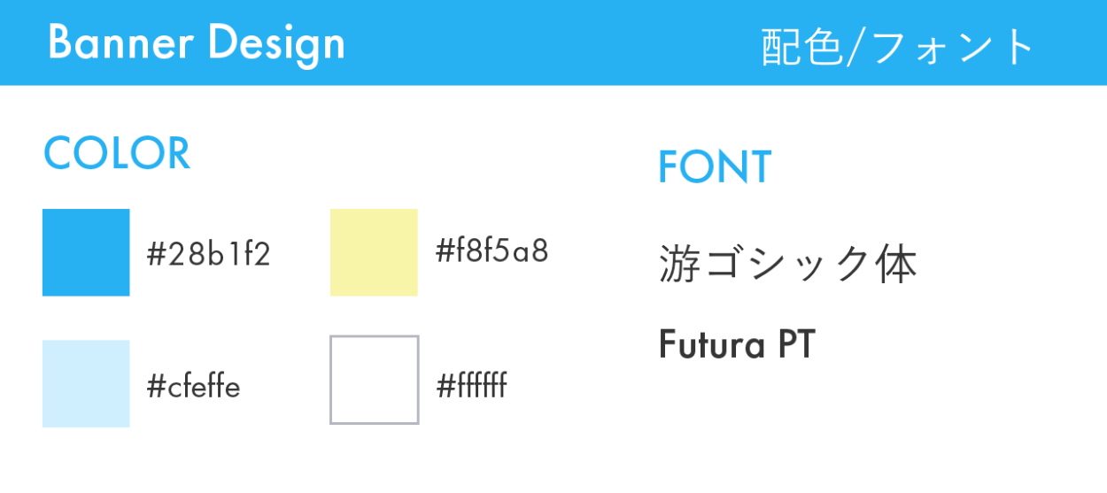 クライアントの要件から、「夏」のキャンペーンであることが読み取れたので、夏らしさを感じられる爽やかなブルーやイエロー、ホワイトを使用しました。また、フォントカラーはくっきり目のブルーや、ブルーを背景に置いたときに見やすいように白を使用し、コントラストがはっきりするようにしました。
