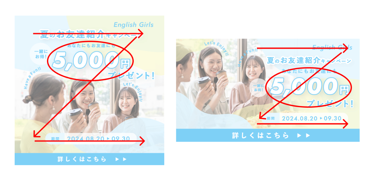キャッチコピーの「夏」「お友達紹介」などの重要なワードは大きくしてメリハリをつけ、重要な要素がわかりやすくなるようにしました。