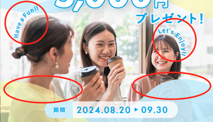 画像は20代女性3人組が楽しそうにお話をしている様子でしたが、英会話をしているイメージがなかなか伝わりにくくかったので、頭の上に「Let`s Enjoy!!」などのテキストを入れることでライトに英語を楽しんでいる雰囲気が伝わるようにしました。また、ふわっとしたあしらいを背景に置くことで女性の柔らかいイメージやポップな印象が出るような表現をしました。