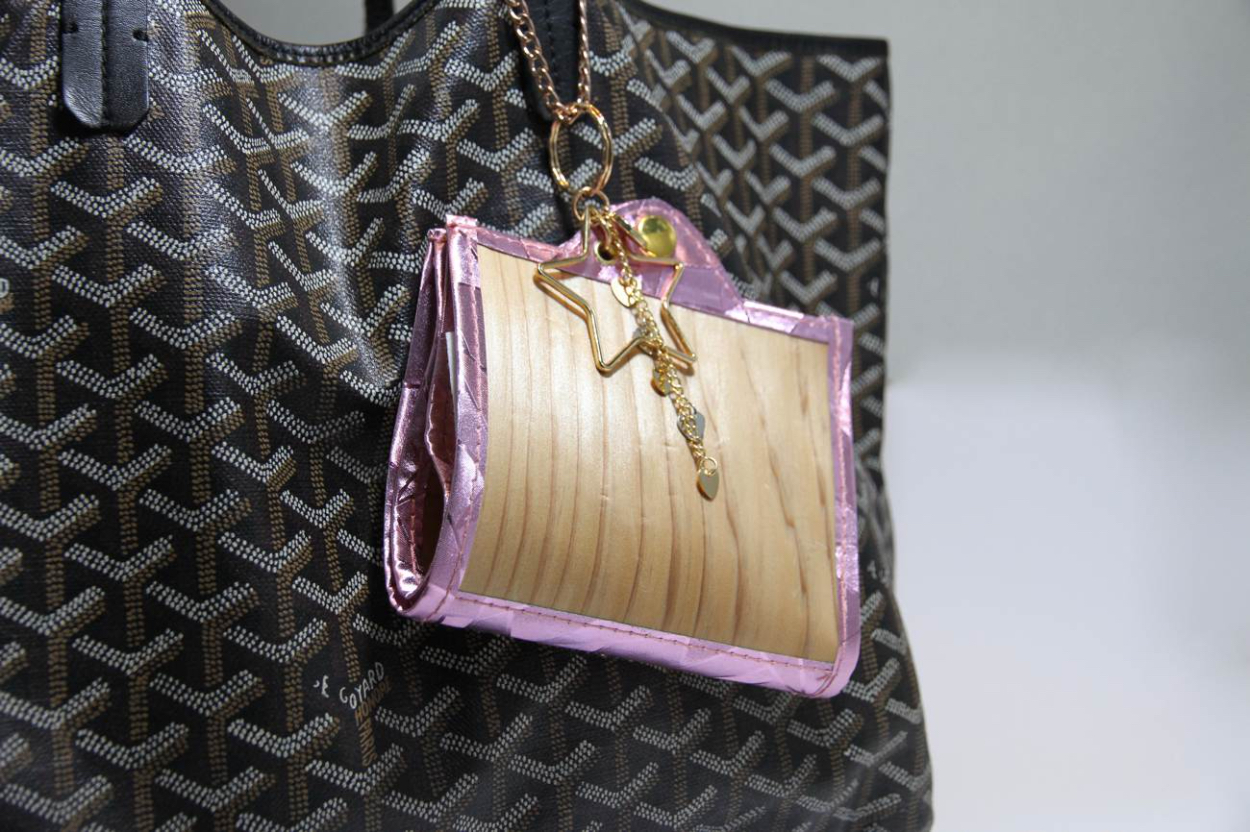 秋田県発、持続可能な秋田杉から生まれた「和」を感じさせる杉の木目をデザインに生かし、それを囲むように彩る鮮やかなパイピング生地。