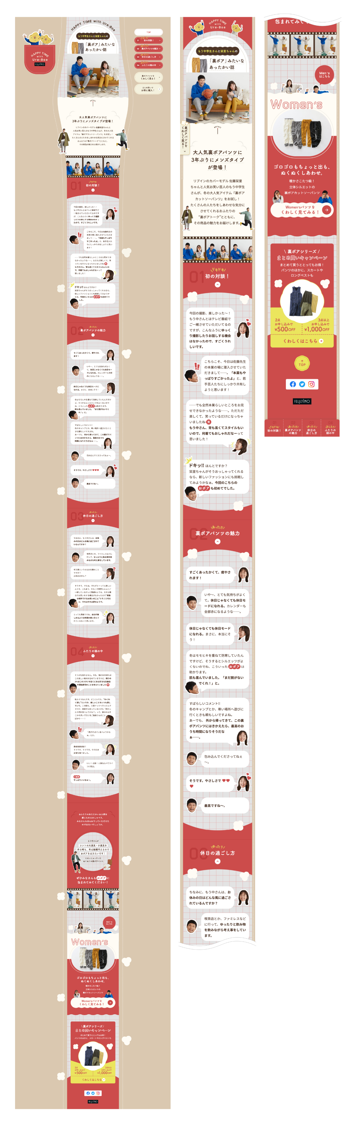 もう中学生さんと栞里ちゃんの「裏ボア」みたいなあったかい話(インタビューサイト) 高野広菜_takanohirona WEBデザイナー OVERVIEW 制作物:フェリシモのロングセラー商品である裏ボアパンツを履いた、もう中学生さんと佐藤栞里さんのインタビューサイト 担当:演出提案とサイトデザインを担当させて頂きました。 WEBSITE