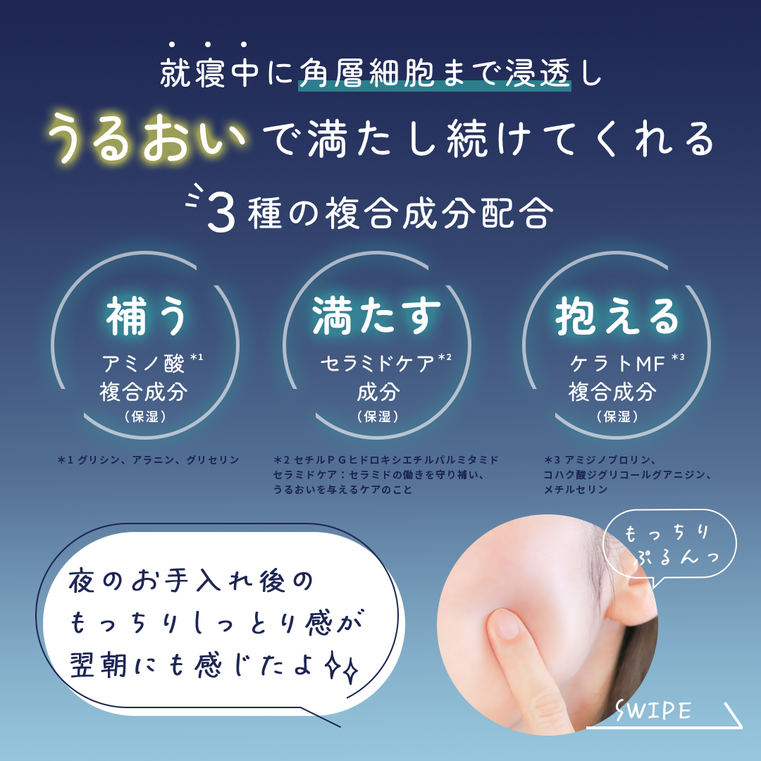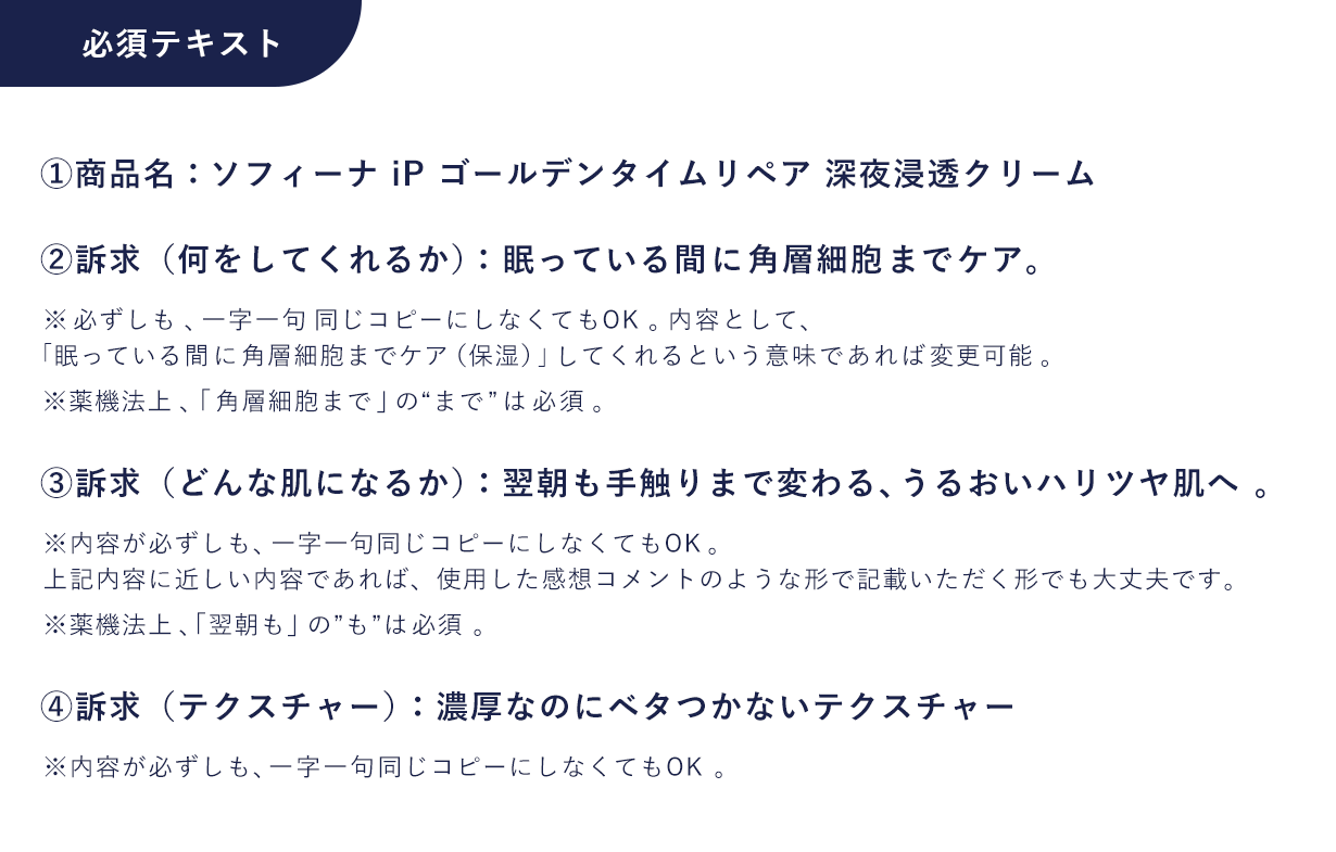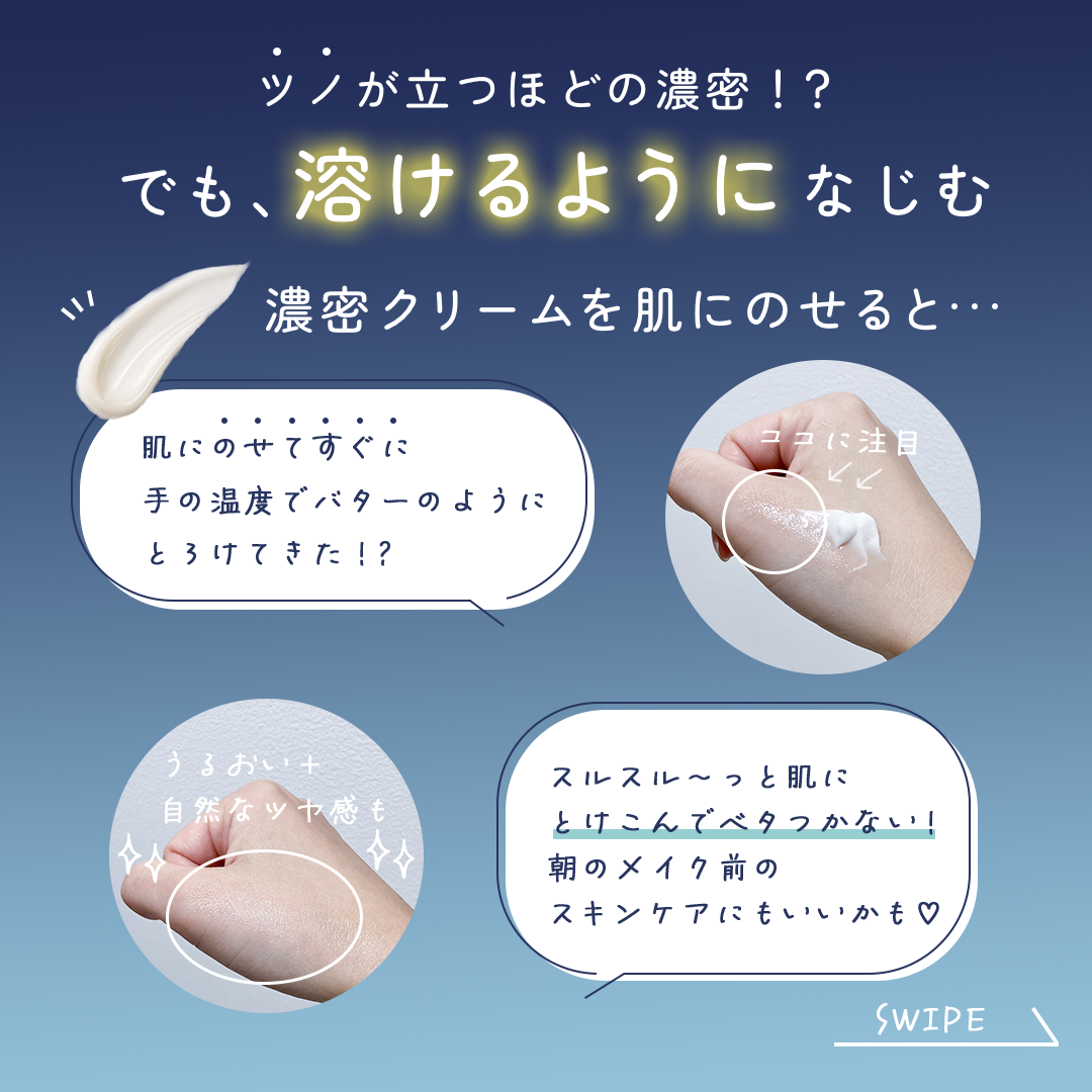 - 文章ではナイトクリームはもちろん、クリームを使用したことない方が『このアイテムなら挑戦してみようかな…」と思ってもらえるような構成を意識しました。(具体的には、ベタつかないテクスチャーの文章の記載だけではなく、肌にのせた時のイメージや、馴染ませた後のイメージ、朝にもつかえそうな馴染み具合など)