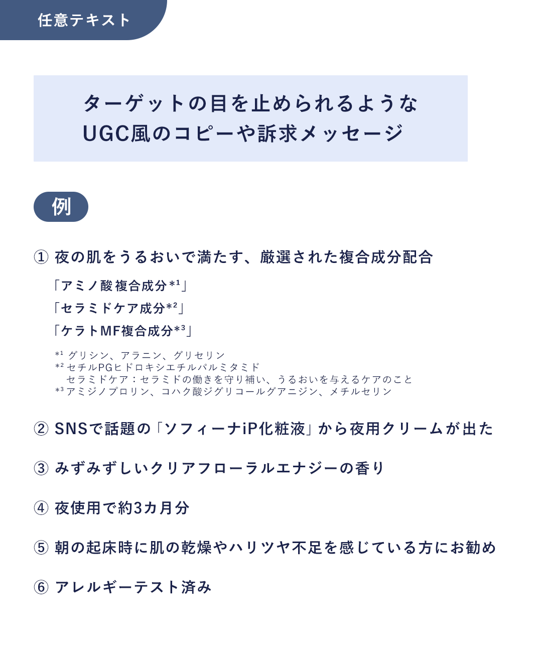 花王様の ソフィーナ iP ゴールデンタイムリペア 深夜浸透クリーム のUGC風バナーを作成し、コンペ形式にて採用いただきました。