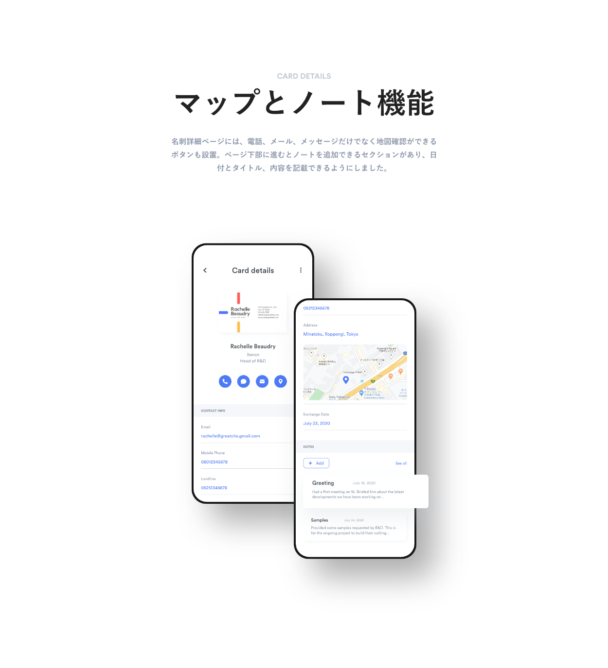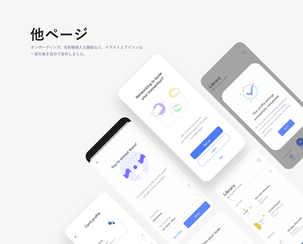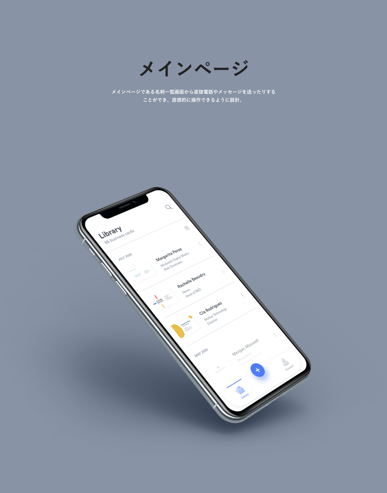 Connect 名刺管理アプリ UI/UXデザイン Yusuke 会社員 OVERVIEW ココダの一環として、名刺管理のUI/UXデザインを行いました。 YEAR 2020 プロトタイプはこちらからどうぞ → プロトタイプ