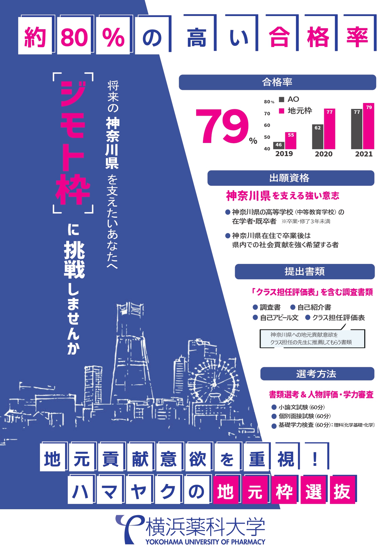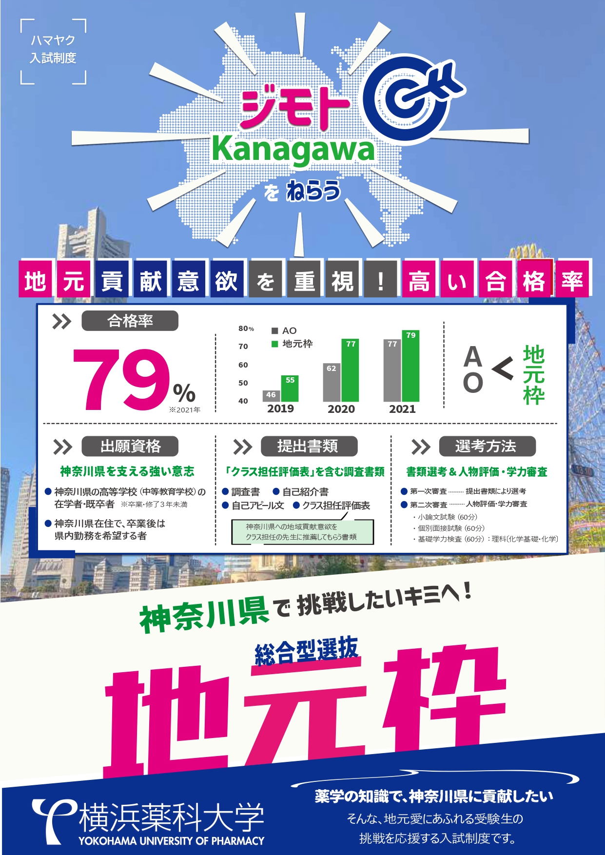 大学がある神奈川県の出身者、神奈川県の高校出身者に向けて、大学卒業後に地元での就職を志すことを条件とする「地元枠入試」をPRするチラシを制作。