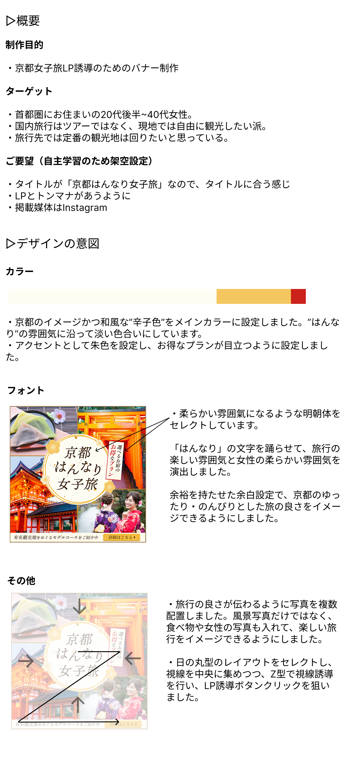[架空案件] 京都女子旅LP誘導バナー Chihiro.H Webデザイナー OVERVIEW Webデザインスクール「HerTech」様の課題の自主学習で作成したInstagram用のバナーです。 YEAR 2025 ▷制作物サイズ:1080px × 1080px使用ツール:Photoshop
