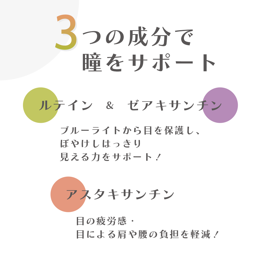- 『ルテイン』『ゼアキサンチン』は参考資料によると効果は同じのようなので、間に『&』を置き、成分についてもまとめてみた。