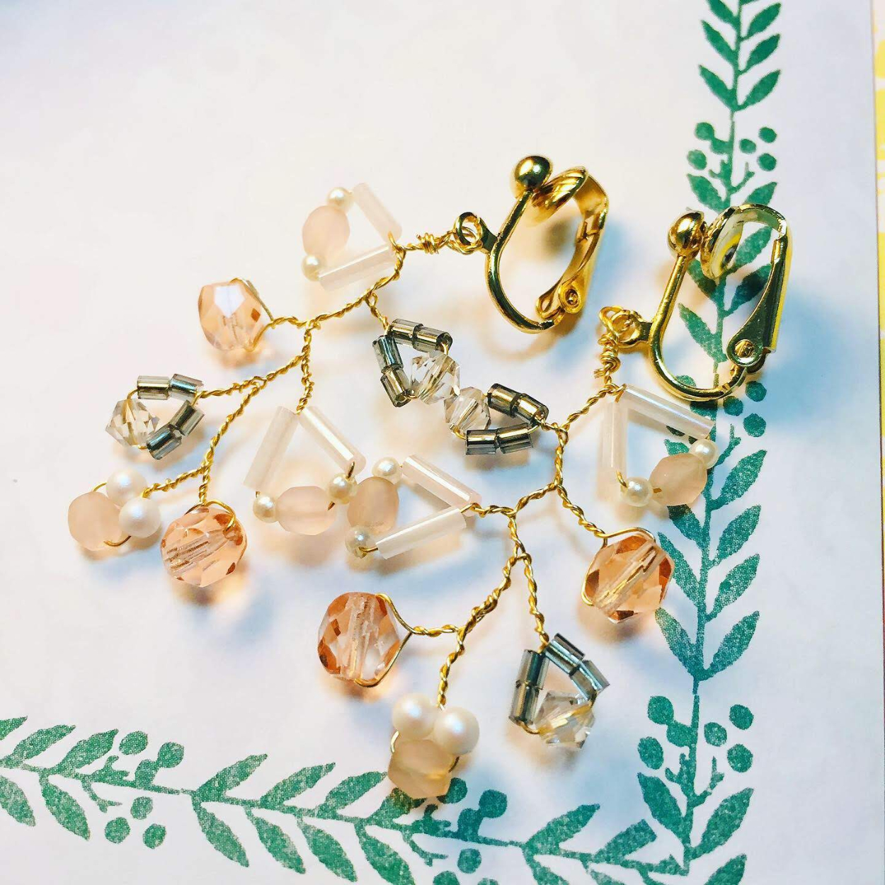 イヤリング(プレゼント) Moe.Y 学生 OVERVIEW 母に贈ったイヤリングです。透明でピンクっぽい色合いのピーズを使い、揺れるデザインで、というリクエストがあったのでこのデザインにしました。 YEAR 2019