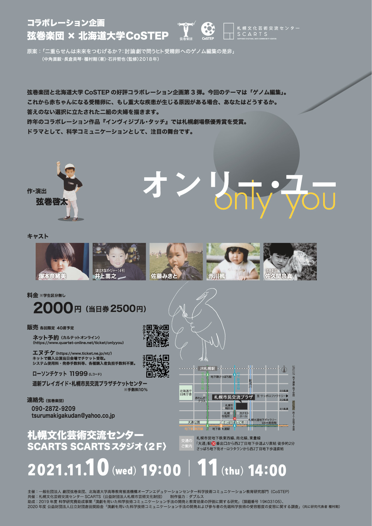 主 催:一般社団法人劇団弦巻楽団、北海道大学高等教育推進機構オープンエデュケーションセンター科学技術コミュニケーション教育研究部門(CoSTEP)