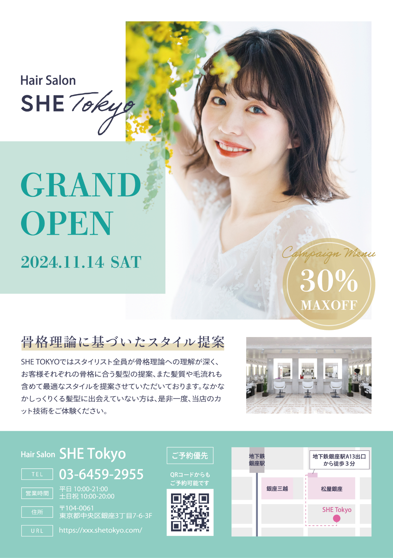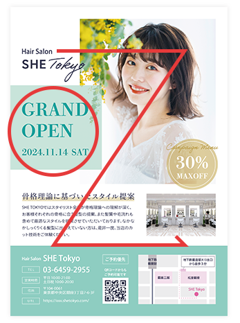 ・情報設計では「GRAND OPEN」の文言で目を惹かせてから、Zの法則を利用し、サロン名・カットの雰囲気・サロンの理念や雰囲気・アクセスが視線の流れで読みやすいようにレイアウトしました。