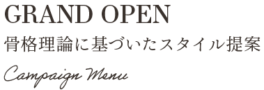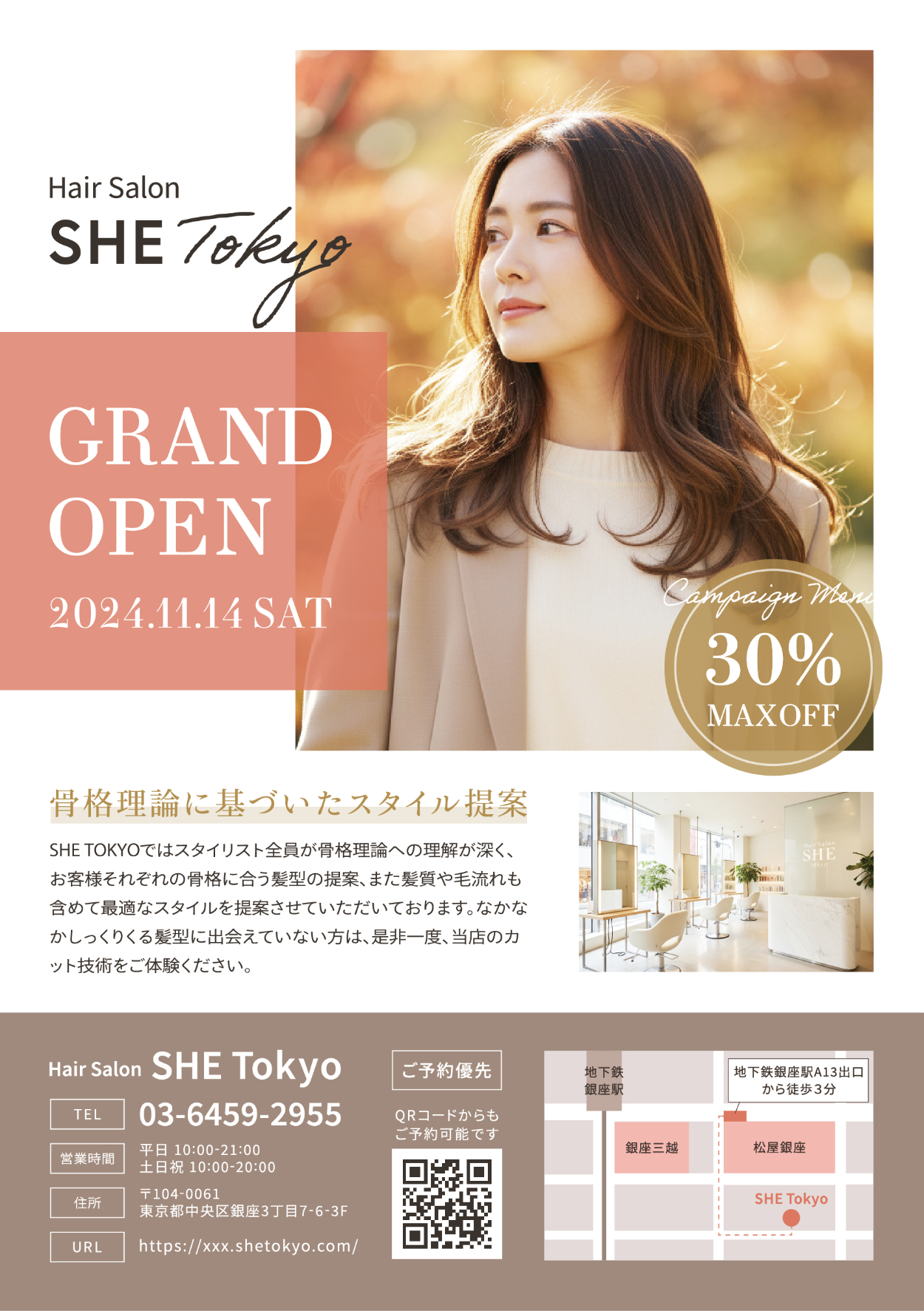 ①「GRAND OPEN」に帯をひき目を惹かせる ②サロン名 ③カットモデルの写真