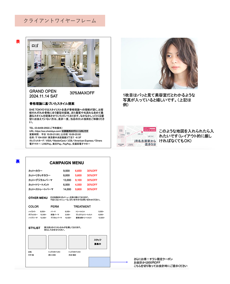 ・クライアントワイヤーフレームには記載はありませんでしたが、美容室のフライヤーだとすぐ判別できるように、サロン名のロゴに「Hair salon」の文言も追加しました。