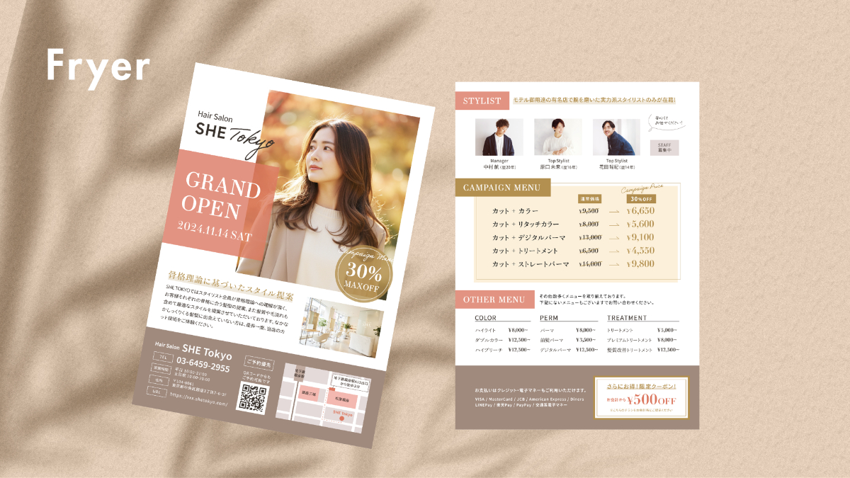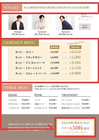 ・裏面では、キャンペーンの価格が一番目を引くように色味やあしらいを調整しつつも、スタイリストの紹介セクションで「モデル御用達」「経歴」の文言を追加して信頼度を上げ、背中を一押しするためのクーポンへと視線がつながるようなレイアウトにしました。