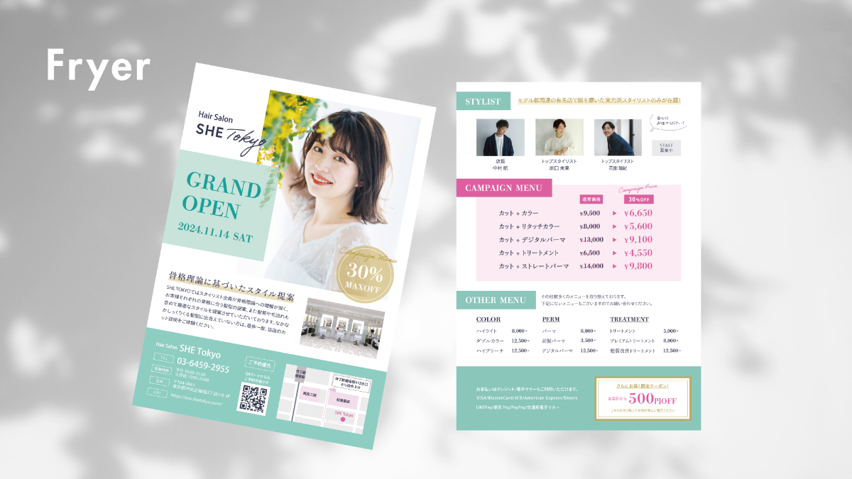 ・裏面では、キャンペーンの価格が一番目を引くように色味を調整しつつも、スタイリストの紹介セクションで「モデル御用達」の文言を追加して信頼度を上げ、背中を一押しするためのクーポンへと視線がつながるようなレイアウトにしました。
