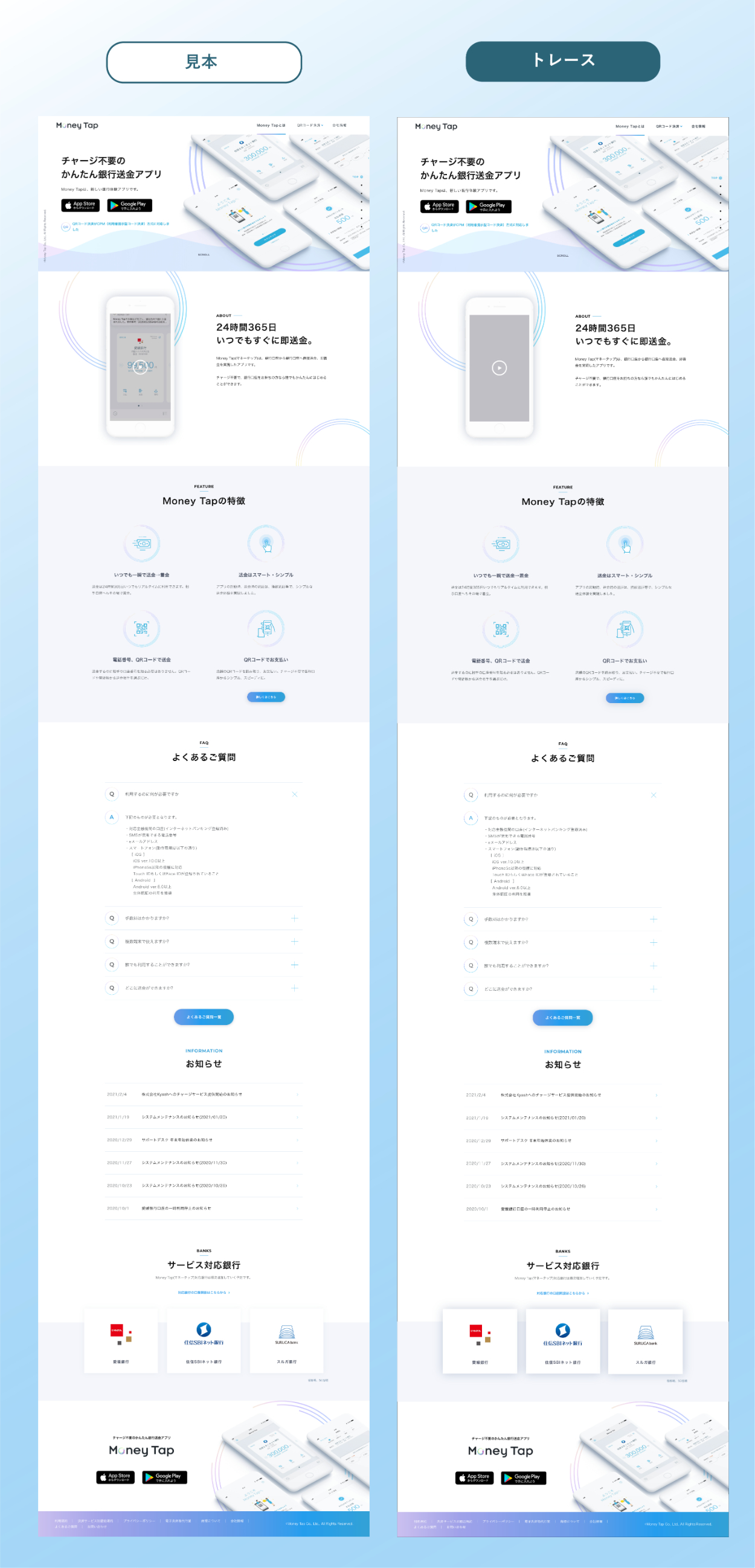 - 目視では気づかなかったが、検証ツールでフォントや余白を調べていた時に、「詳しくはこちら」のボタンや、銀行名とロゴの白い正方形にシャドウがついていることがわかり、トレース時に忘れずに影をつけました