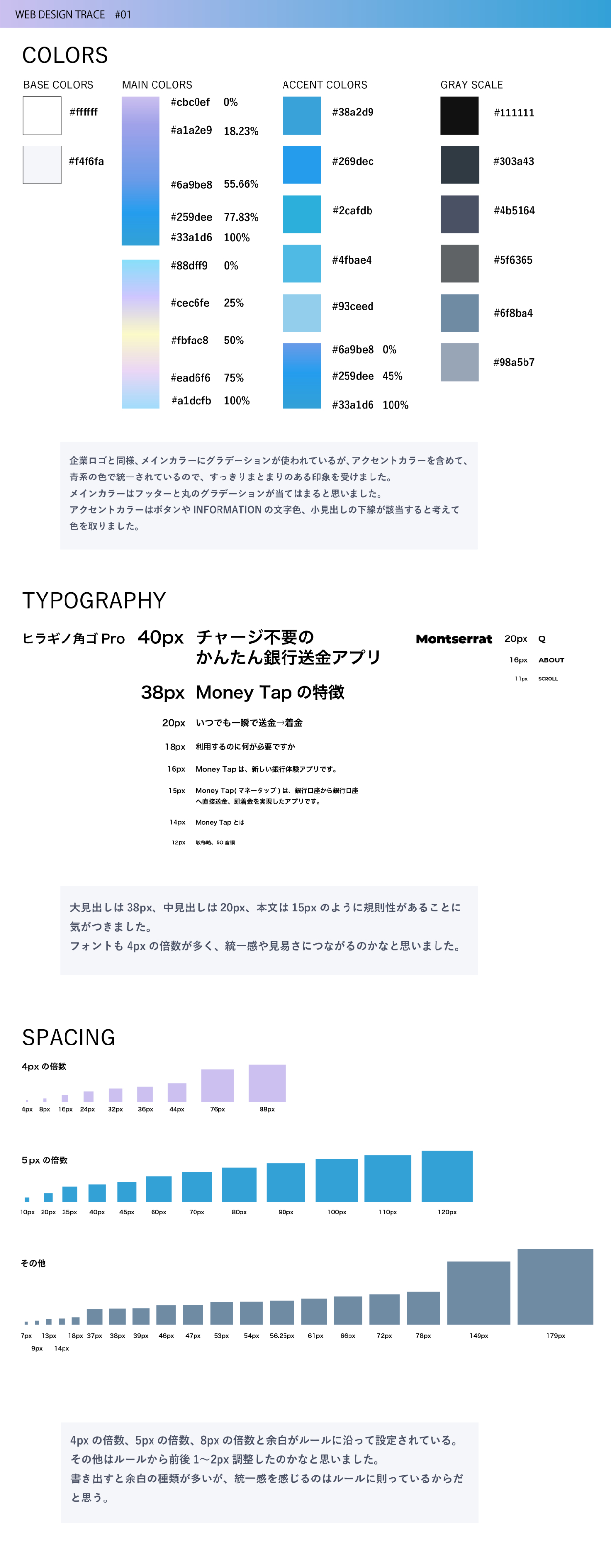 スタイルガイドを作ることで、色、余白やフォントの種類や文字の大きさの規則性があることがわかりました。