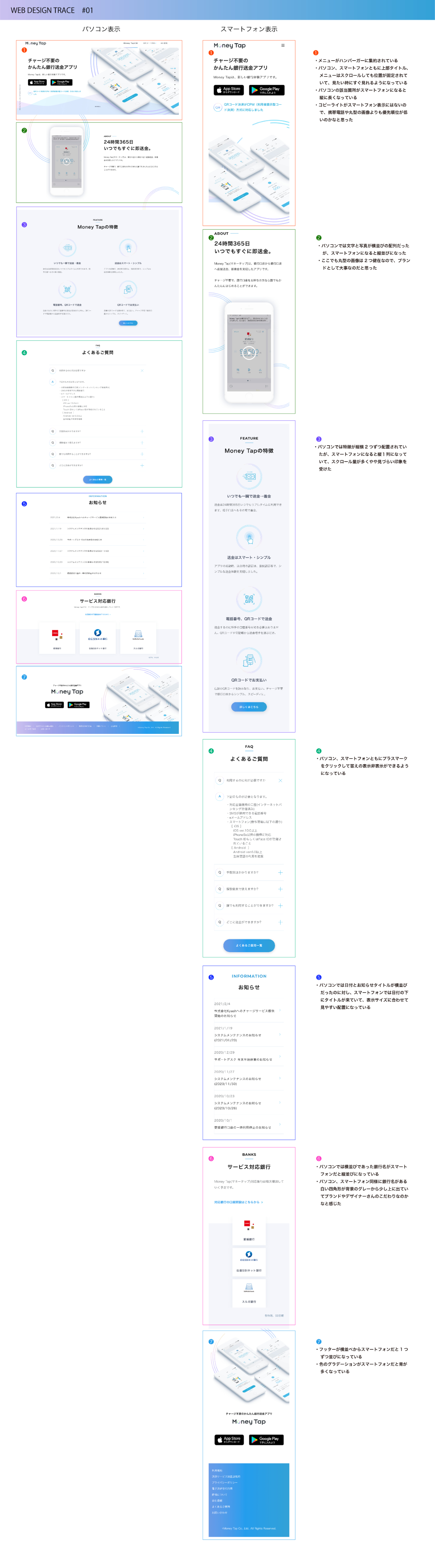 MULTI CREATOR COURSE Designerの3つ目の課題。Webページトレースに取り組みました。 トレースに加えて、スタイルガイドの作成、PCとスマートフォンでのレイアウトの違いの分析を行いました。 使用ツール:Illustrator