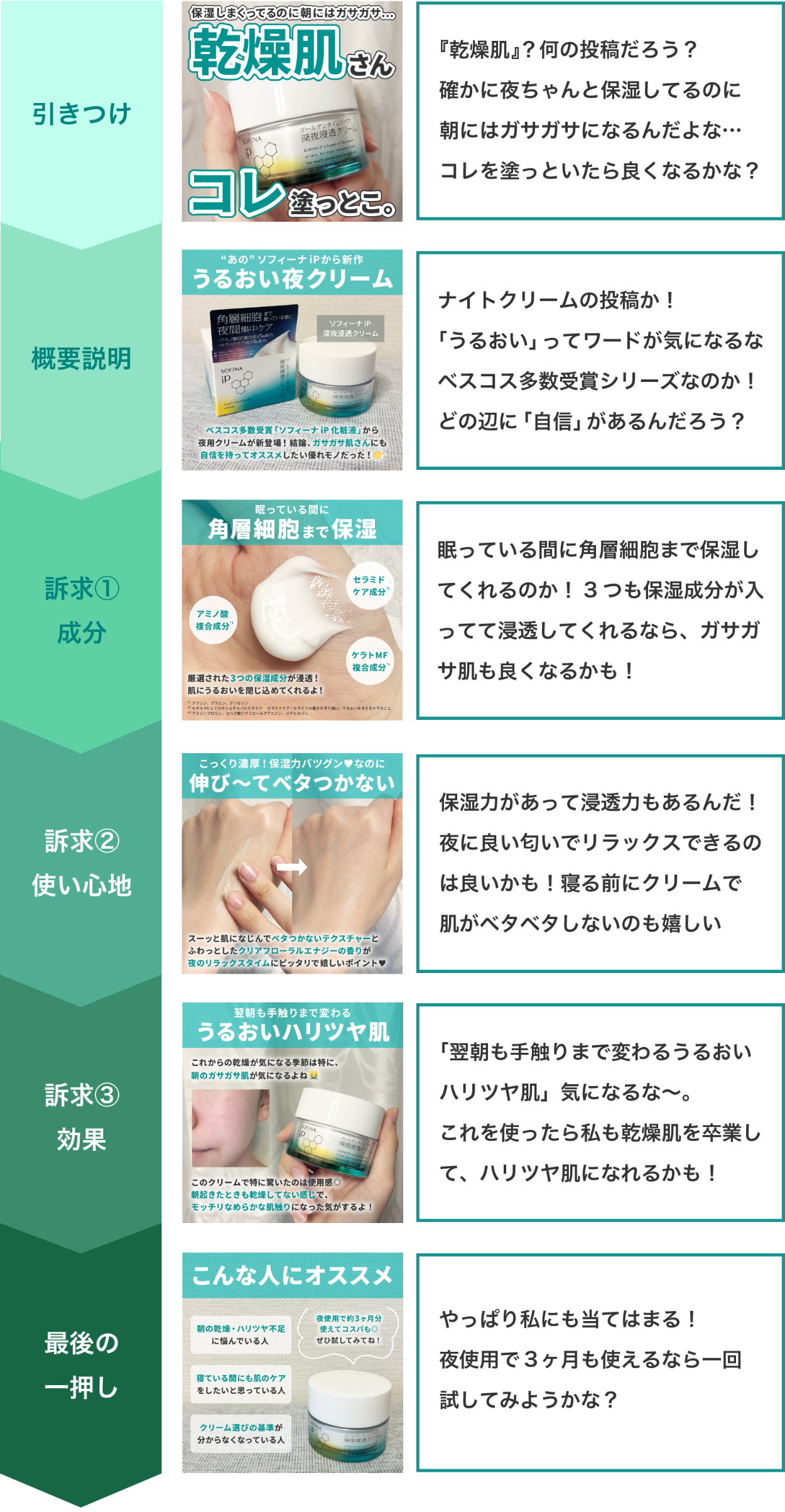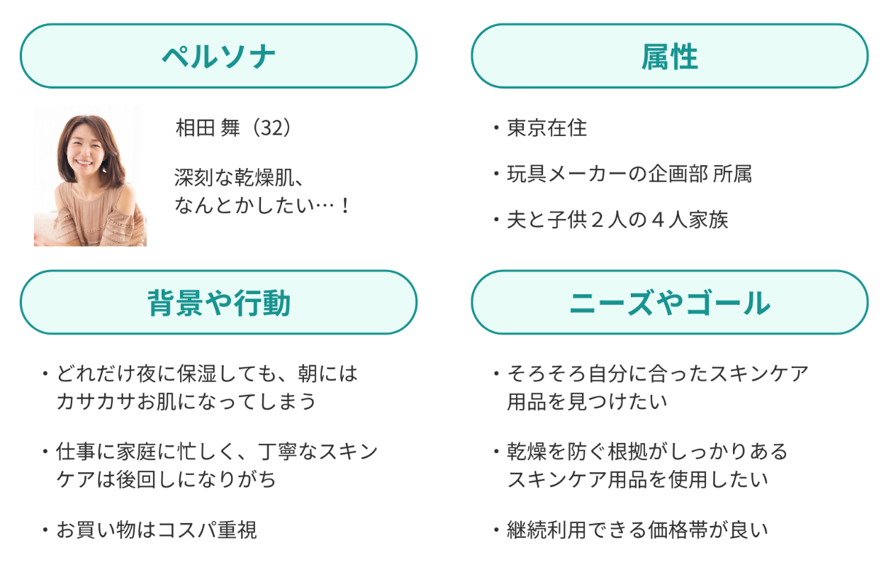 「乾燥肌」というワードを上部に大きく配置することで、ターゲットにこの広告を「自分ごと化」してもらえるよう意識しました。