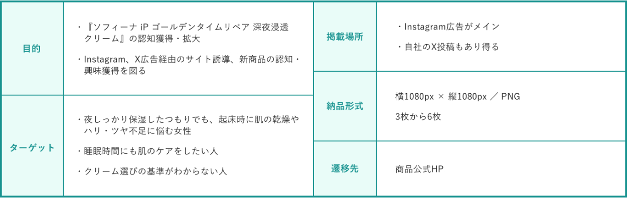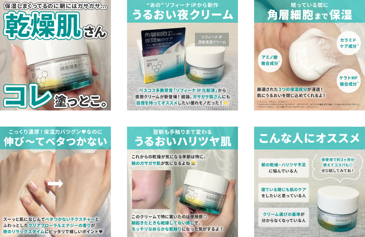 自主制作で、花王株式会社様のブランド『ソフィーナ iP』の新商品(ナイトクリーム)の広告を制作しました。「UGC風バナーの制作を」とのご要望のもと、消費者目線のテキスト考案からデザインまで一気通貫で行いました。(制作時間:2日間/Illustrator, Photoshop)