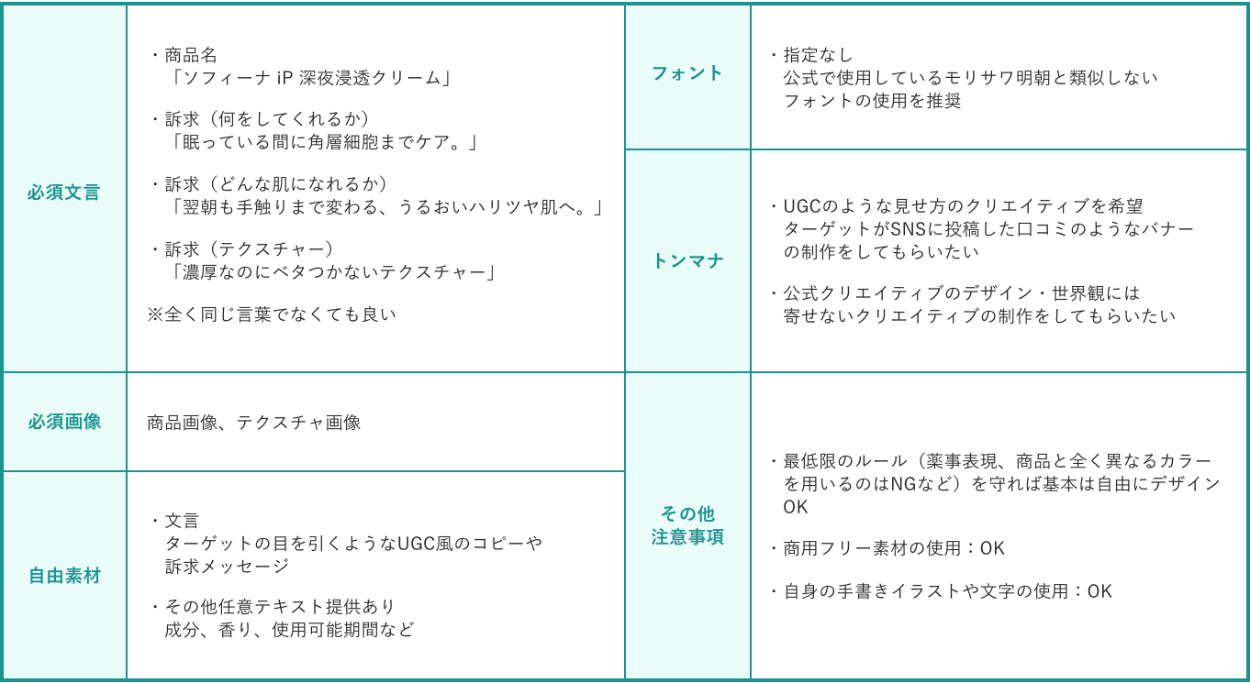情報量が多いバナーのため、フォントは可読性の高いゴシック体を使用しました。普段から目にする機会が多いタイプの、癖がなくベーシックなフォントを使用することで、クオリティの高過ぎない、UGC感のあるクリエイティブになるようにしました。