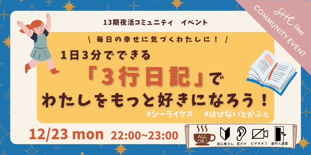 イベント名「毎日の幸せに気づくわたしに!1日3分でできる「3行日記」でわたしをもっと好きになろう」