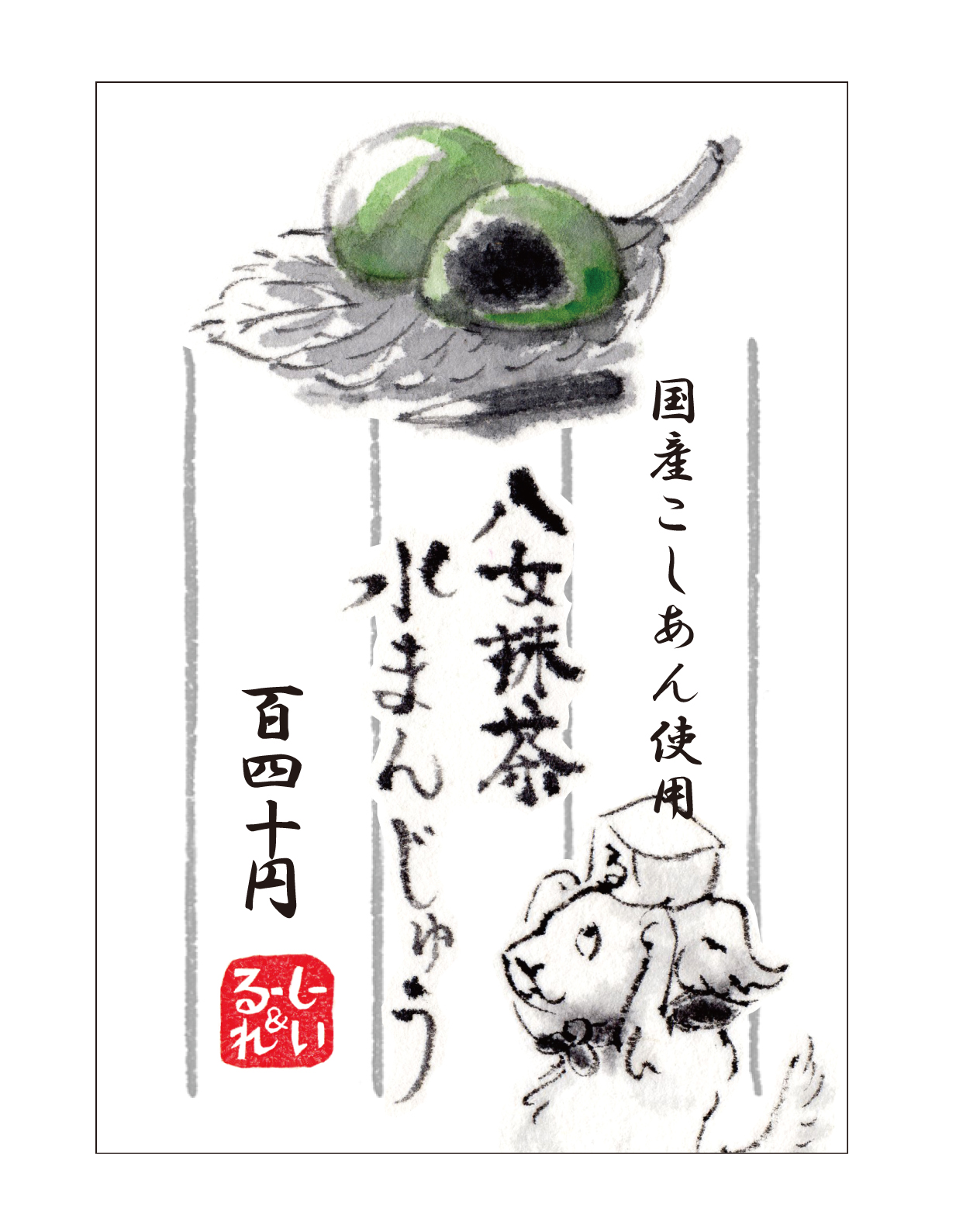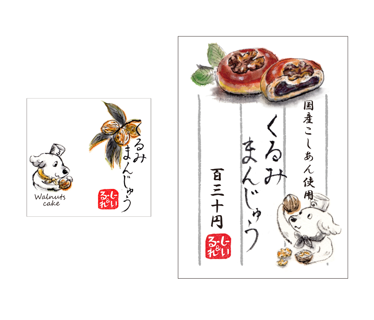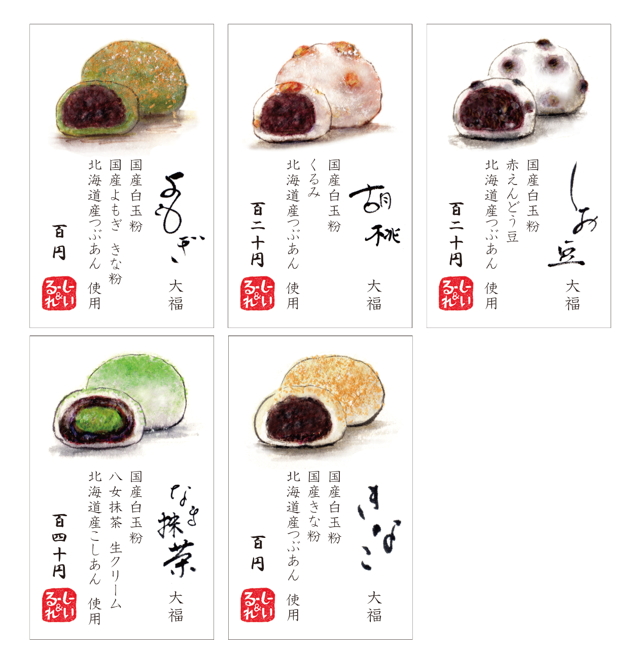 Lucy&Ray 和菓子パッケージデザイン maya イラストレーター きゃらめるくるみまんじゅうシール&ポップくるみまんじゅうシール&ポップ栗名月シール&ポップ大福もちポップ大ポップ(名刺サイズ)くるみゆべしポップ八女抹茶水まんじゅうポップ