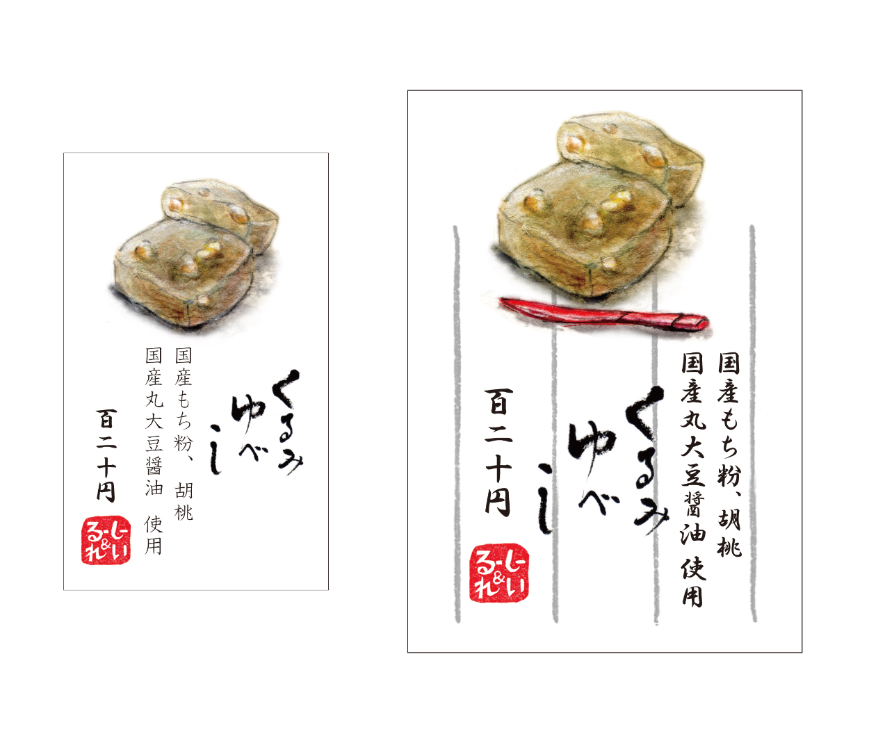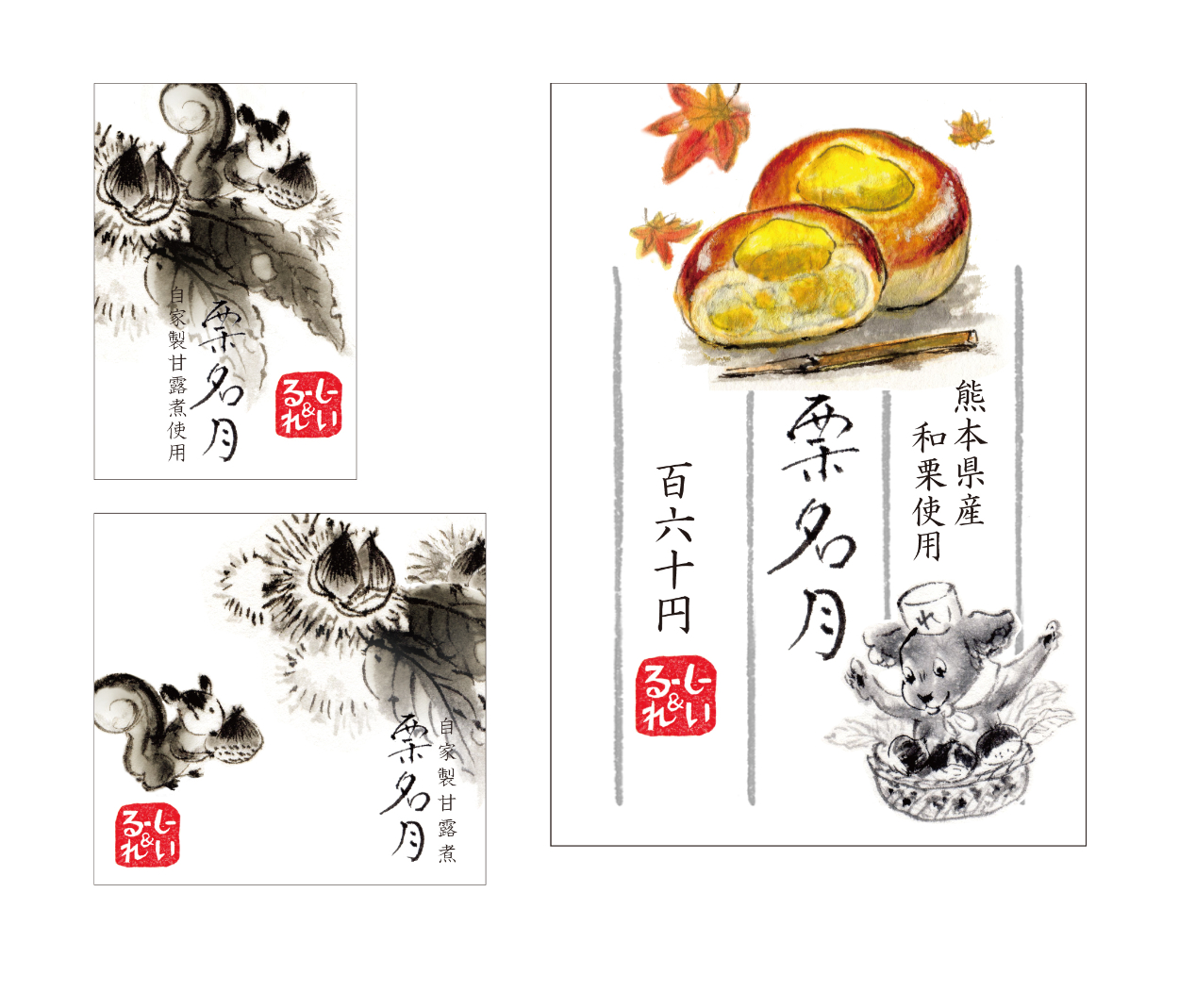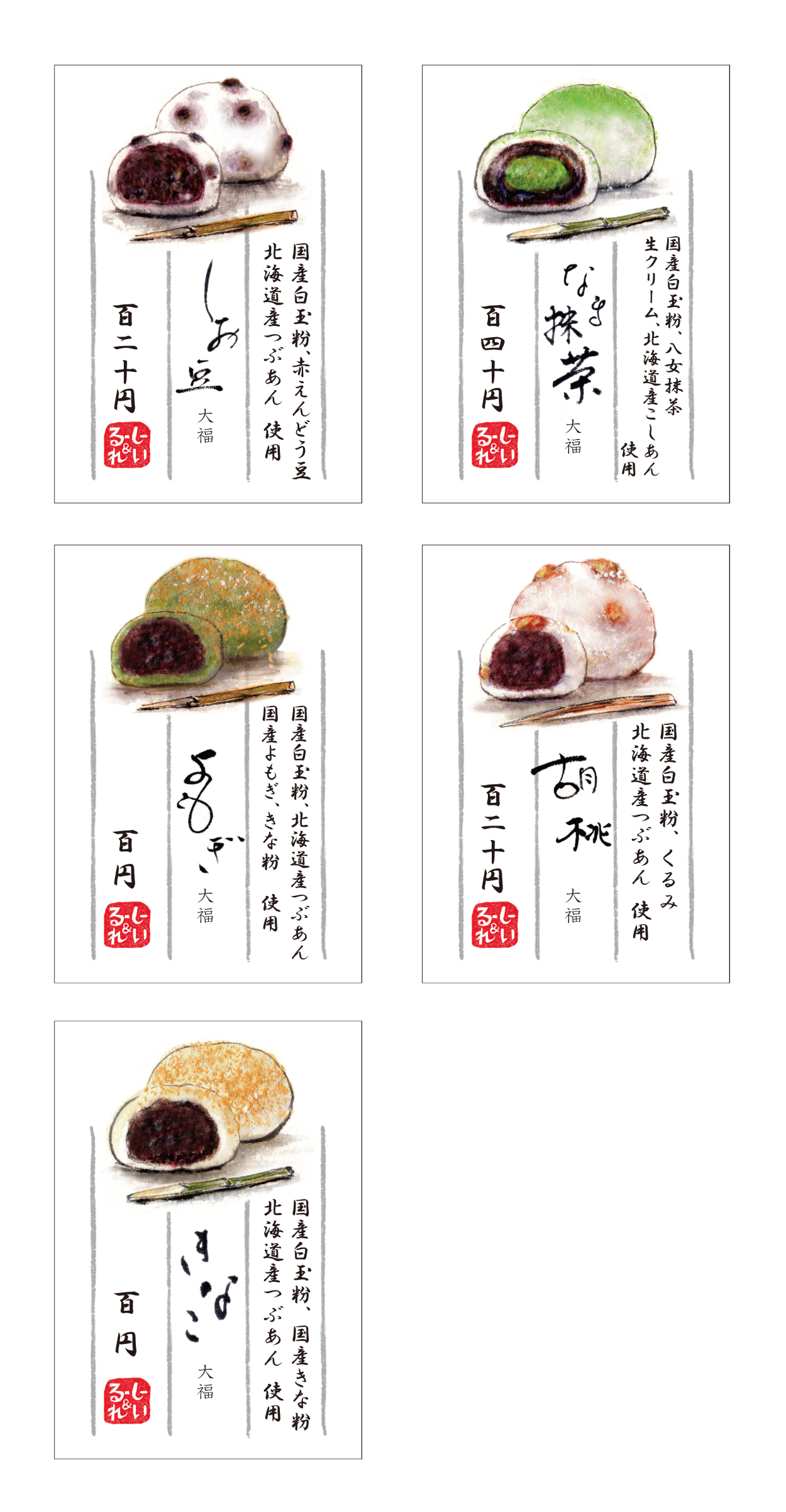 Lucy&Ray 和菓子パッケージデザイン maya イラストレーター きゃらめるくるみまんじゅうシール&ポップくるみまんじゅうシール&ポップ栗名月シール&ポップ大福もちポップ大ポップ(名刺サイズ)くるみゆべしポップ八女抹茶水まんじゅうポップ