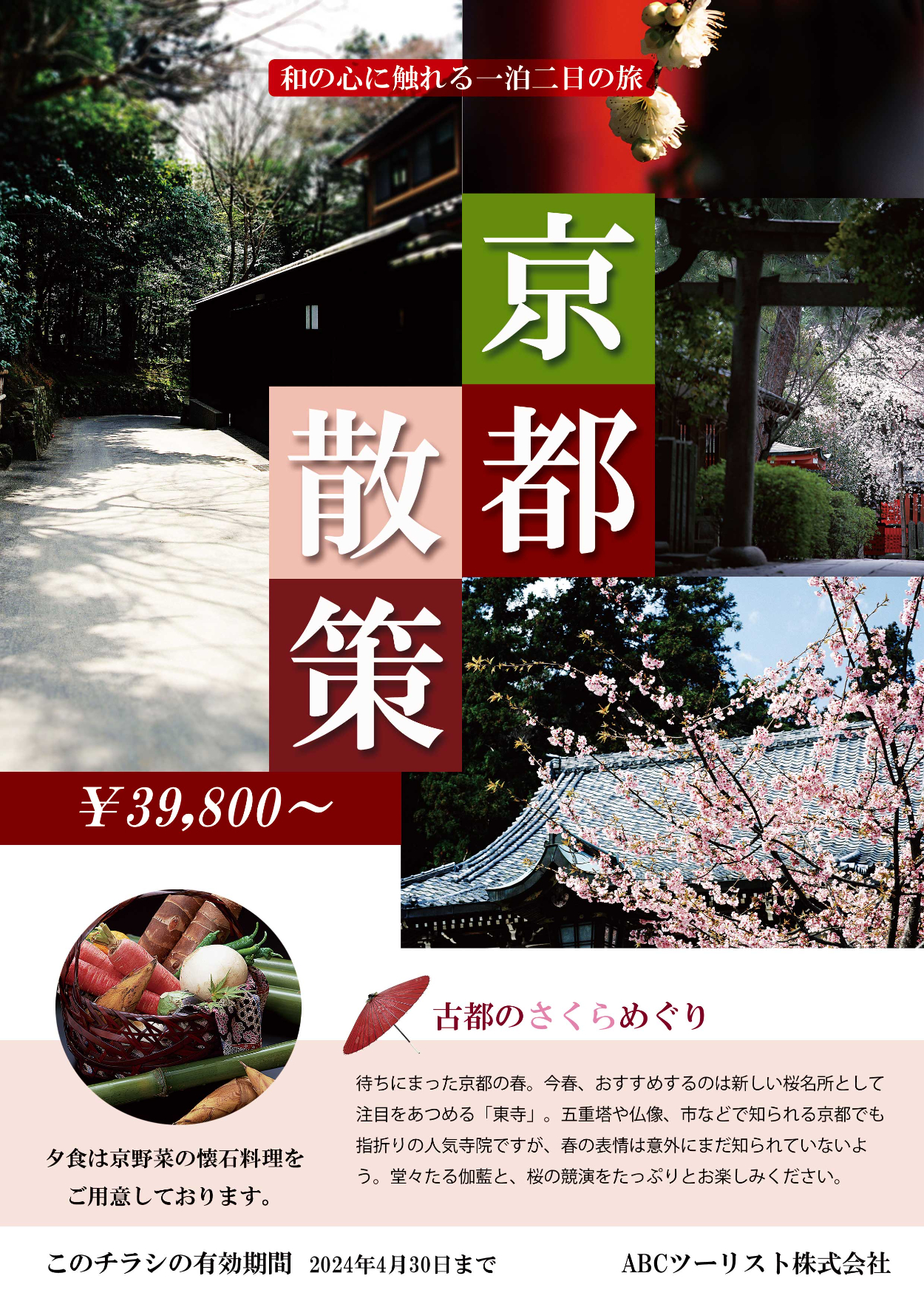 旅行会社の集客を目的とし、「新たな京都の楽しみ方の紹介」をテーマに想定したチラシを作成しました(※学習教材をもとに作成)