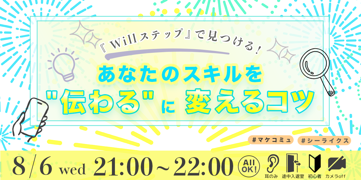 ・8月のイベントタイトル「『Willステップ』で見つける!あなたのスキルを『伝わる』に変えるコツ」