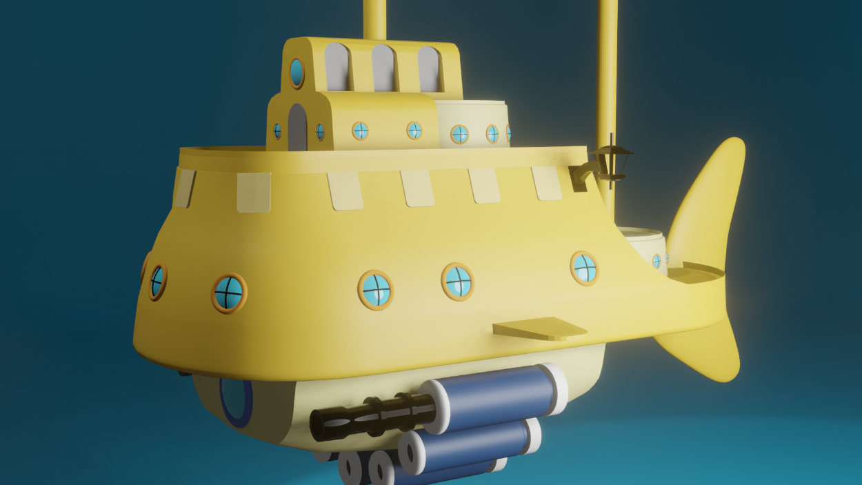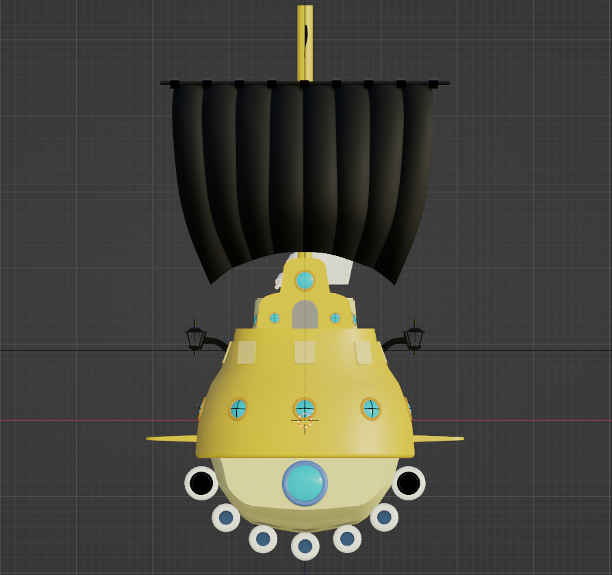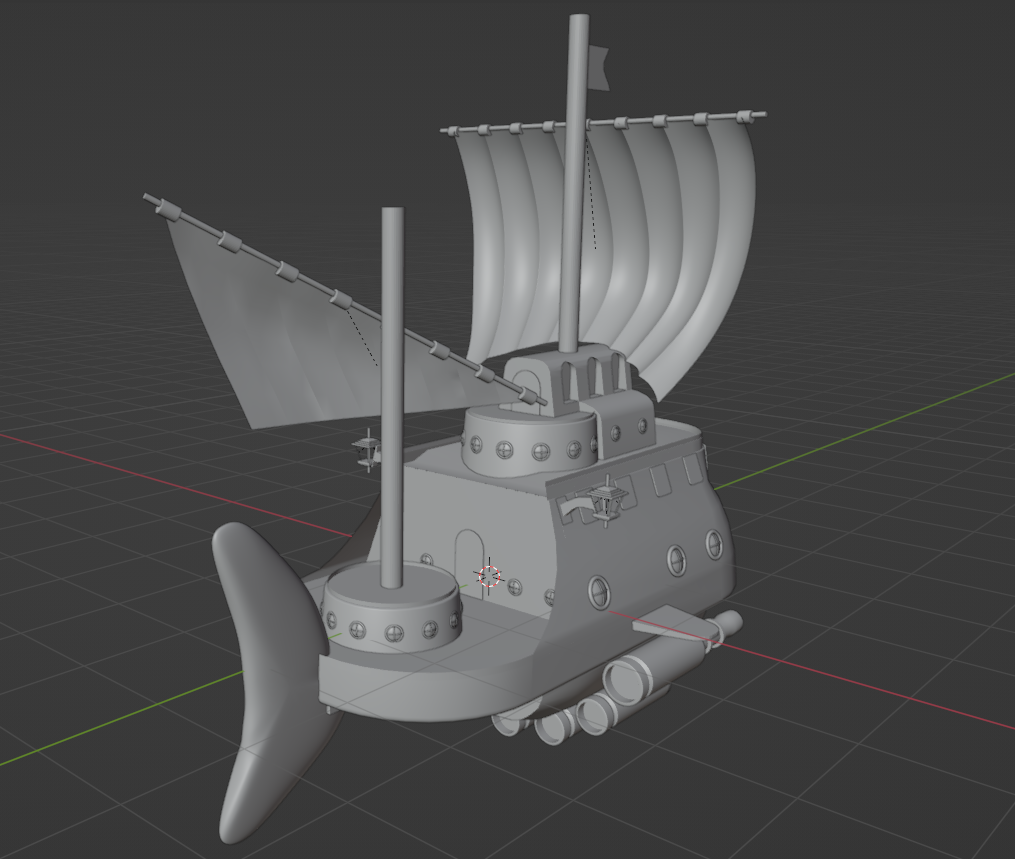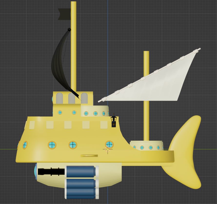 3Dモデリング作品 後藤慎吾 Unityエンジニア OVERVIEW Blender学習のため、『ワンピース』のハートの海賊団の潜水艦を自主制作しました。制作期間は3ヶ月ほどです。 プラモデルを見ながら、細かな凹凸や曲線を調整しました。マストの帆が風を受けて膨らんでいる様子を再現しました。◾️ リファレンス