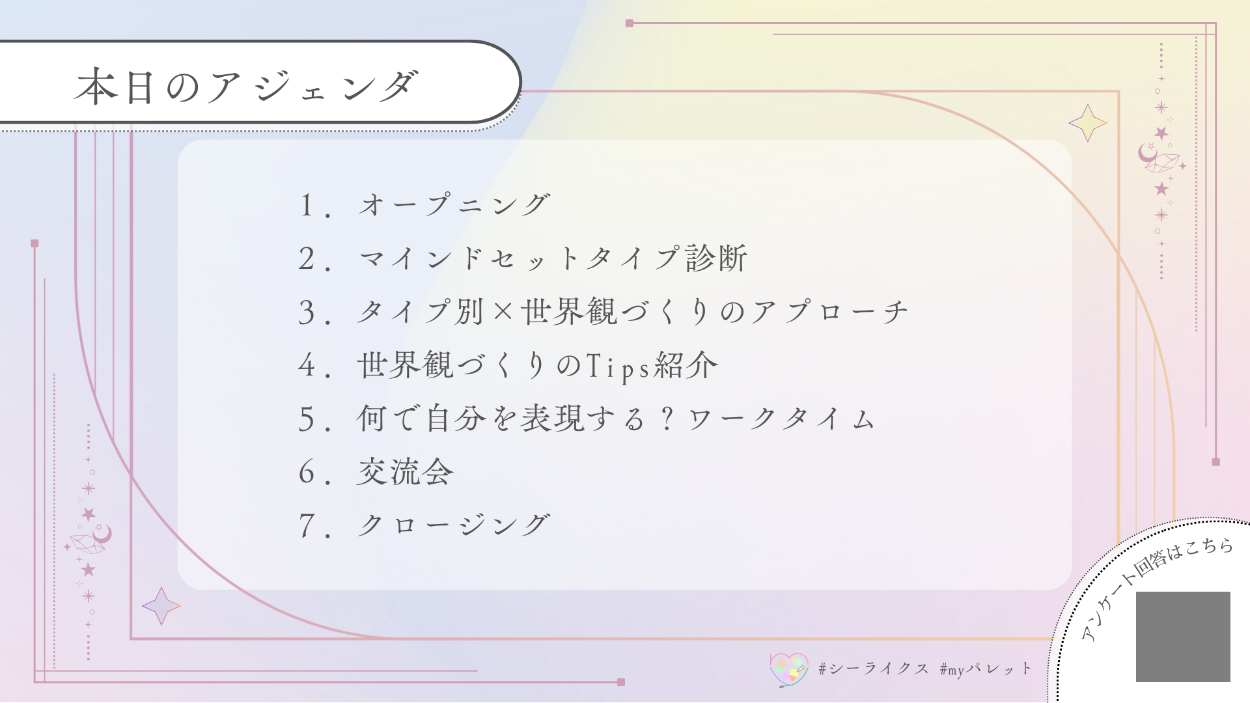 受講生向けオンラインイベントの投影スライドのテンプレート、及び本文制作を行いました。 ※企画内容の進行表制作は別の者が担当