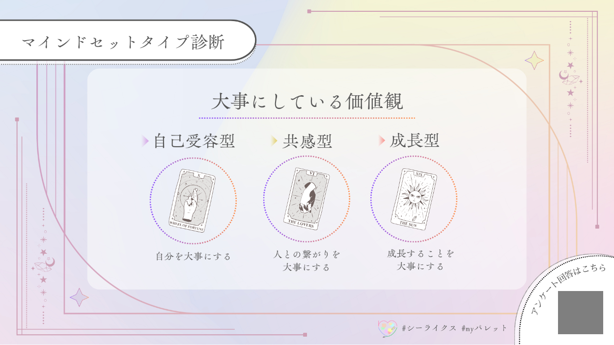 ・イベント内で「自己プロデュースカードを制作する」というワークがあったので、自分を俯瞰して見つめ直すキッカケにもなる、占い=タロットカードの世界観を参考に、テンプレートを作り上げました。
