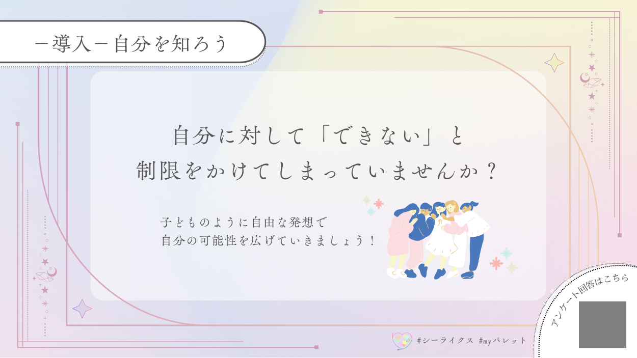 ・自分と向き合うきっかけが欲しい、自分にはできない、と制限をかけてしまってる人に自分らしさを再発見してもらう