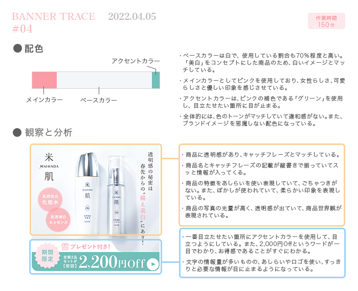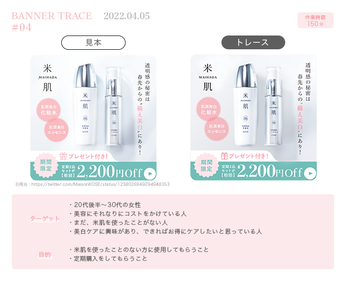 SHElikes MULTI CREATOR PROJECTで、バナートレース課題に取り組みました。トレースする際に、ターゲット・目的・配色の3点について意識しながら取り組み、分析もおこないました。