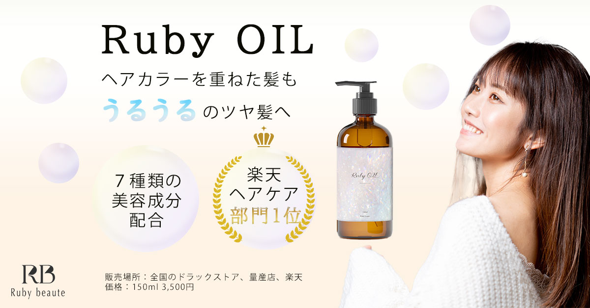Ruby OILはヘアカラーを楽しむ方のお悩みに寄り添ったヘアオイルとして開発されました。ヘアカラーで傷んだ髪のパサつきを、潤いある滑らかなツヤ髪へ導きます。保湿美容成分を7種類配合しており、傷みのケアはもちろん、カラーの色持ちも良くしてくれます。普段の生活やリラックスタイムにも気にならない無香料。発売場所:全国のドラックストア、量販店、楽天 ・価格:150ml 3,500円