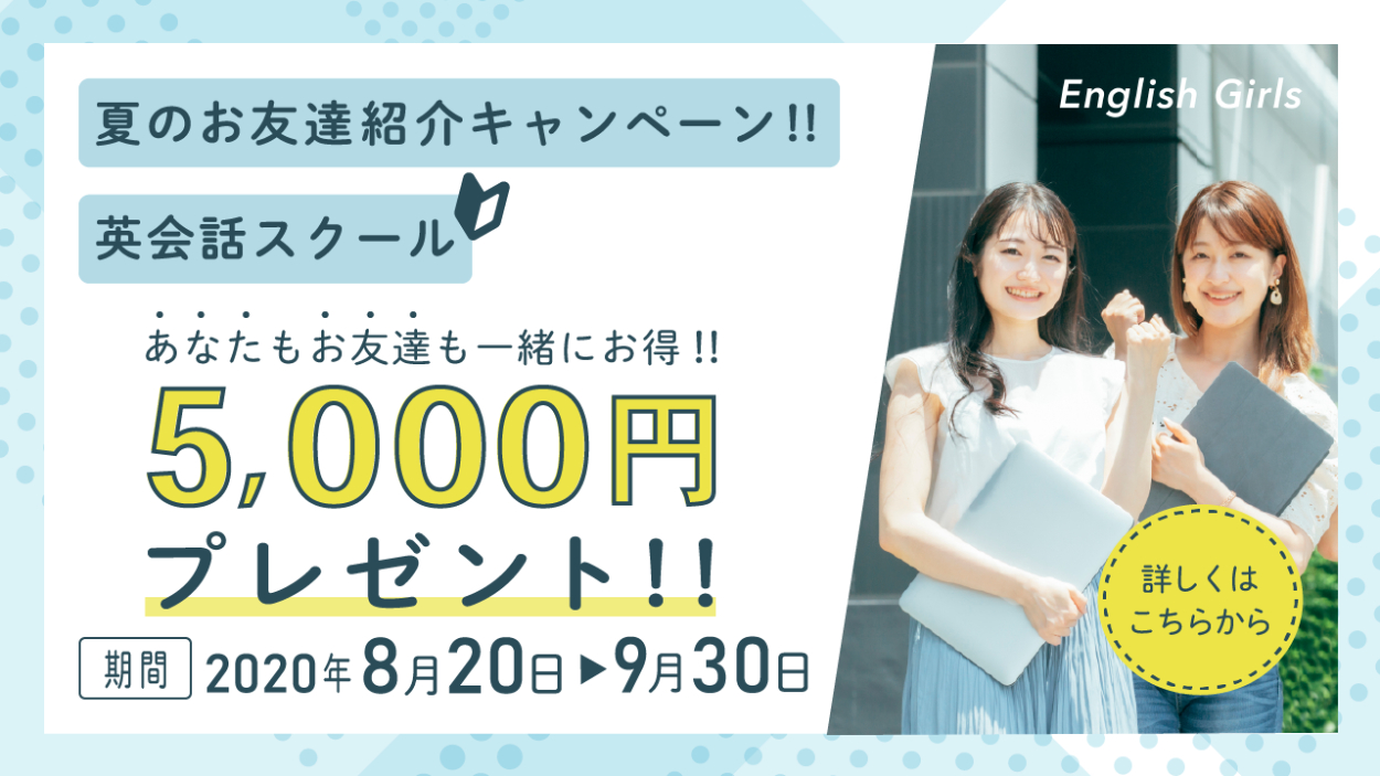 <文言>①夏のお友達紹介キャンペーン ②あなたにもお友達にも5,000円プレゼント ③期間:2020年8月20日~9月30日 ④一緒にお得!