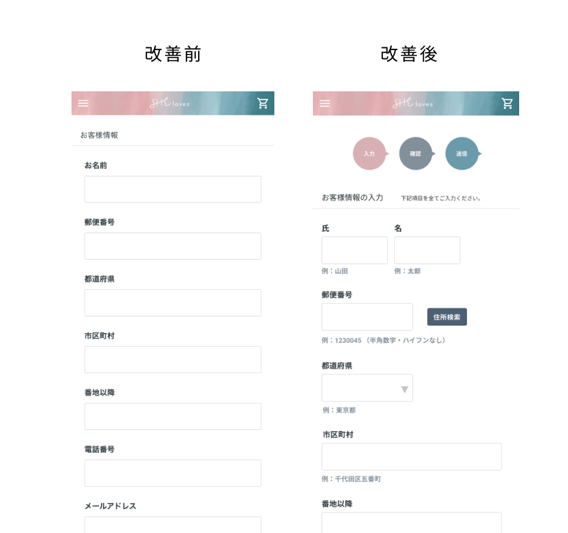 ②の問題点については、入力フォームの下に入力例を記載したり、項目名を改める事で解決した。例えば、「お名前」という表記だと、氏名間にスペースがいるかどうかであったり、カタカナ・ひらがな・漢字のうちどれで入力すれば良いのかわからないという問題点があった。そこで、改善後のデザインのように、項目を氏と名で分け、さらに入力フォームのすぐ下に入力例を記載しました。