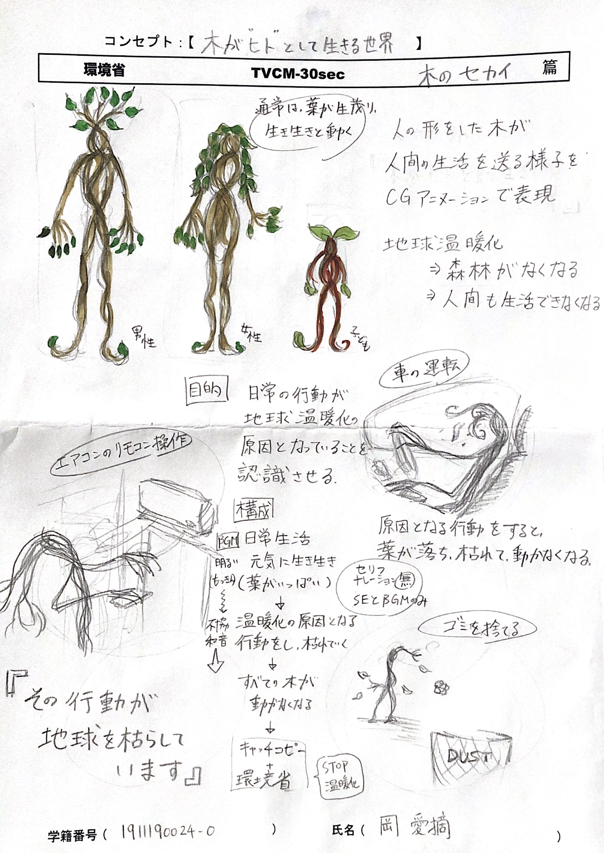 環境省 CM 絵コンテ あづみ OVERVIEW 広告制作実習課題 オリエンシート絵コンテ企画内容地球温暖化の危機感を伝えるためにいちばん効果的なのは子供にトラウマを植え付けるほどの恐怖であると考えた。工夫した点アニメーションでナレーションやセリフを入れないことで、子供にも理解がしやすい演出とした。