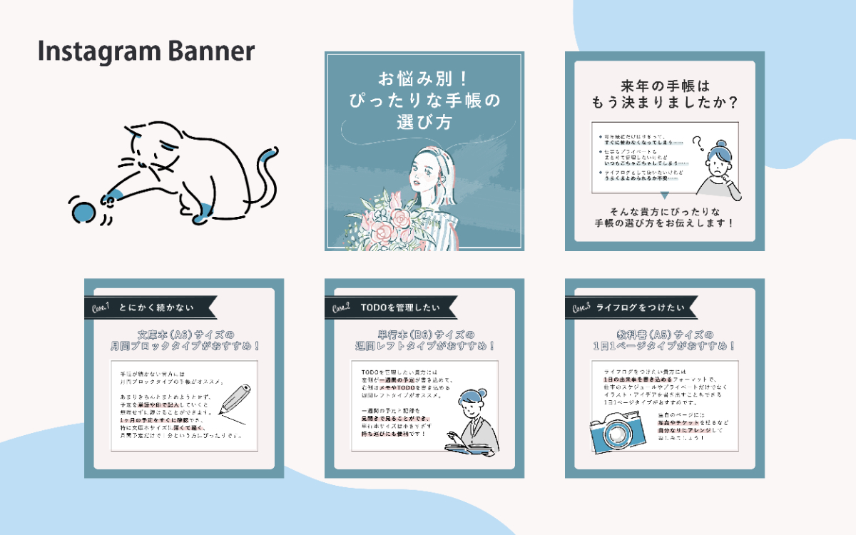ミレニアムライフコーチングカンパニーであるSHE株式会社様のSHElikes公式InstagramおよびTwitterで投稿するSNSバナーを制作しました。 『お悩み別!ぴったりな手帳の選び方』をテーマに、企画立案からヴィジュアルデザイン(バナー制作)まで行いました。