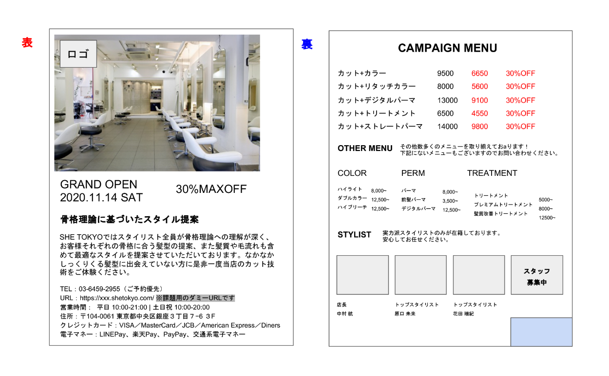 SHElikes MULTI CREATOR COURSEでの課題、美容室フライヤー制作に取り組みました。架空クライアントの依頼内容をもとにフライヤーをデザインしました。〔制作時間:2週間 使用ツール:Illustrator Photoshop〕