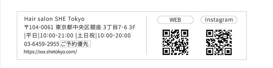 フライヤーは情報量が多いのでシンプルとのバランスは難しくなりますが「一目でわかる」を意識して、画像やQRコードを使用してわかりやすくしました。お客様のスタイルの参考になるかと思い、InstagramとWEBサイトのQRコードを追加しました。