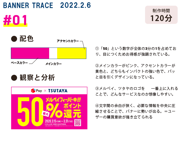 今回のトレースしたバナーは、写真などの素材が少なく文字中心な為、色見やジャンプ率が特に意識されていて、インパクトのあるバナーである。「なぜこのフォントなのか?」「なぜこの余白なのか?」と、常に問題意識を持つことで目的を見失わず、ターゲットに伝わるデザインに近づくのではないかと感じた。