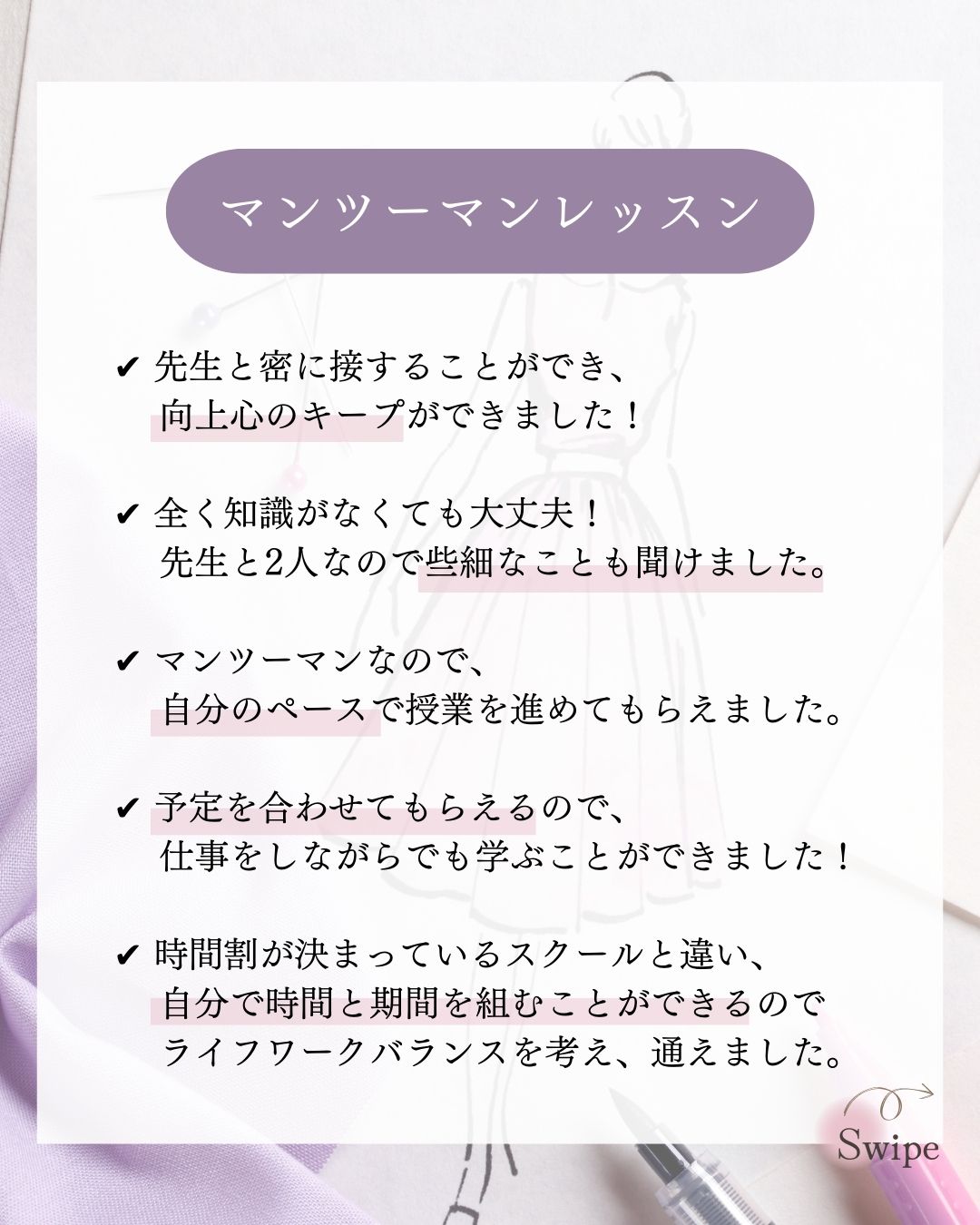 スクールをより多くの方に知ってもらうため、SNSを通じてサロンのターゲット層である女性に刺さるコンテンツを発信したい。