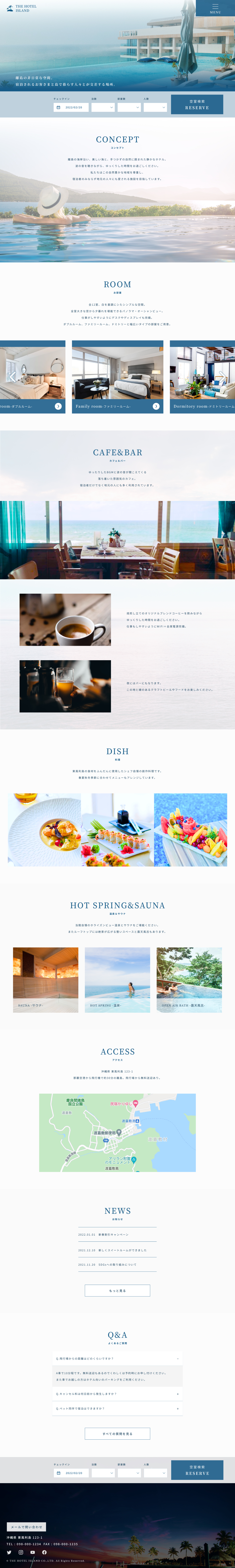 離島の非日常な空間であるホテルなので、ホテルからの景色が魅力的に伝わるような写真をFVで広く使用し、景色を画面いっぱいに表示したかったのでハンバーガーメニューにしましたが、MENUと表示して、メニューがあることをわかりやすくしました。